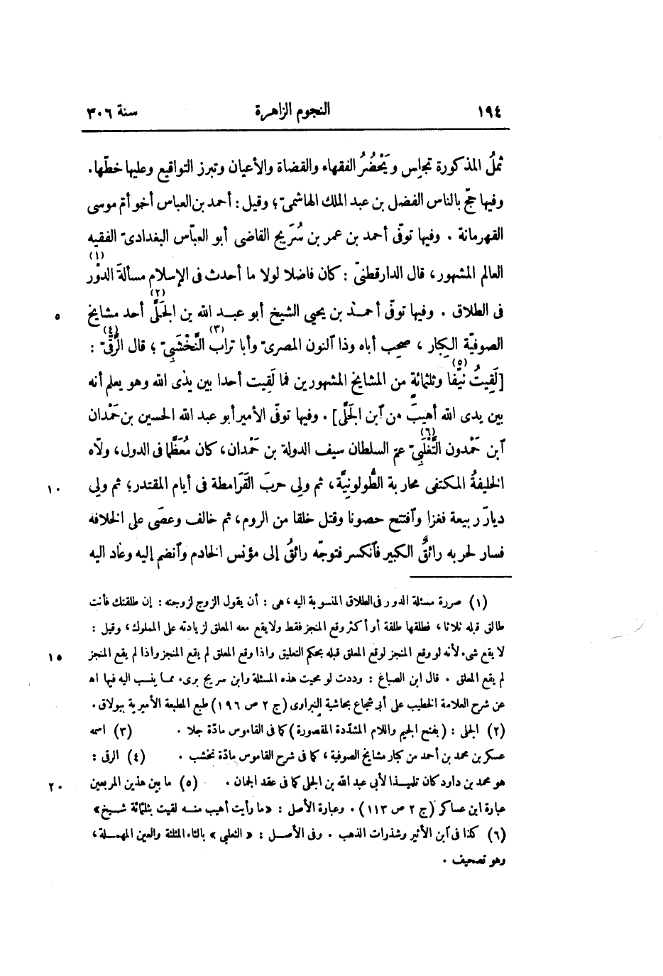 وفيها حجّ بالناس الفضل بن عبد الملك الهاشمىّ؛ وقيل: أحمد بن العباس أخو أمّ موسى القهرمانة. وفيها توفّى أحمد بن عمر بن سريج القاضى أبو العبّاس البغدادىّ الفقيه العالم المشهور، قال الدارقطنىّ: كان فاضلا لولا ما أحدث في الإسلام مسألة الدور «1» فى الطلاق. وفيها توفّى أحمد بن يحيى الشيخ أبو عبد الله بن الجلّى «2» أحد مشايخ الصوفيّة الكبار، صحب أباه وذا النون المصرىّ وأبا تراب «3» النّخشبىّ؛ قال الرّقىّ «4» :