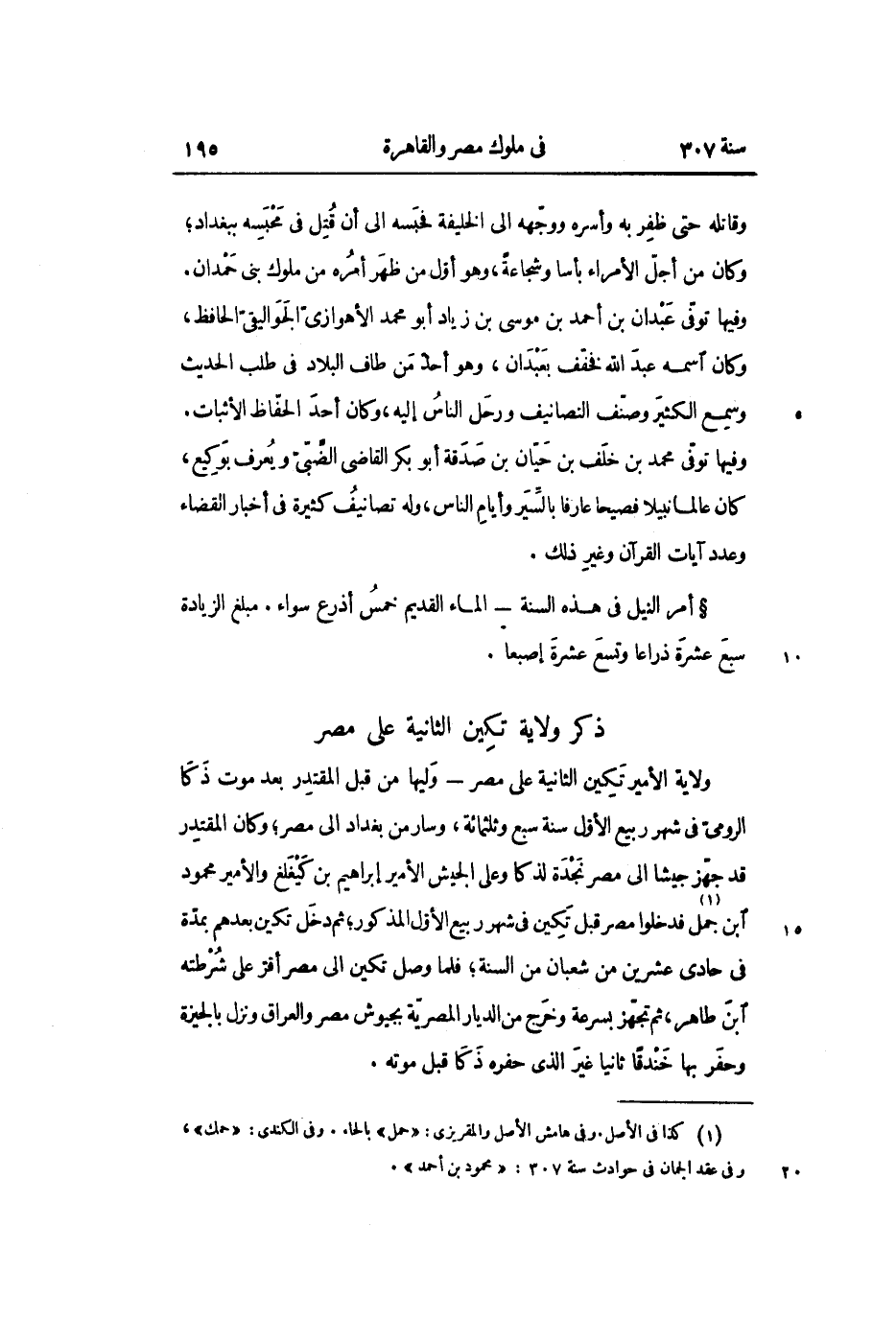 ولاية الأمير تكين الثانية على مصر- وليها من قبل المقتدر بعد موت ذكا الرومىّ في شهر ربيع الأوّل سنة سبع وثلثمائة، وسار من بغداد الى مصر؛ وكان المقتدر قد جهّز جيشا الى مصر نجدة لذكا وعلى الجيش الأمير إبراهيم بن كيغلغ والأمير محمود ابن جمل «1» فدخلوا مصر قبل تكين في شهر ربيع الأوّل المذكور؛ ثم دخل تكين بعدهم بمدّة فى حادى عشرين من شعبان من السنة؛ فلما وصل تكين الى مصر أقرّ على شرطته ابن طاهر، ثم تجهّز بسرعة وخرج من الديار المصريّة بجيوش مصر والعراق ونزل بالجيزة وحفر بها خندقا ثانيا غير الذي حفره ذكا قبل موته.