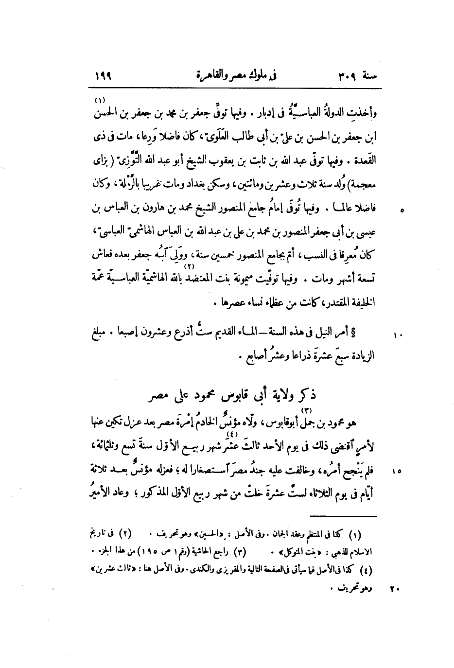 هو محمود بن جمل «3» أبو قابوس، ولّاه مؤنس الخادم إمرة مصر بعد عزل تكين عنها لأمر اقتضى ذلك في يوم الأحد ثالث «4» عشر شهر ربيع الأوّل سنة تسع وثلثمائة، فلم ينجح أمره، وخالفت عليه جند مصر استصغارا له؛ فعزله مؤنس بعد ثلاثة أيّام في يوم الثلاثاء لستّ عشرة خلت من شهر ربيع الأوّل المذكور؛ وعاد الأمير