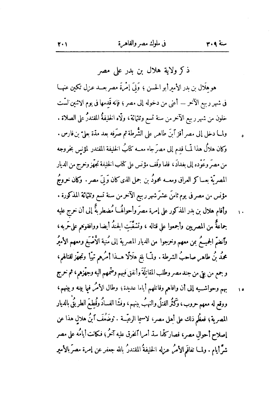 هو هلال بن بدر الأمير أبو الحسن؛ ولى إمرة مصر بعد عزل تكين عنها فى شهر ربيع الآخر- أعنى من دخوله إلى مصر؛ فإنه قدمها في يوم الاثنين لسّت خلون من شهر ربيع الآخر من سنة تسع وثلثمائة، ولّاه الخليفة المقتدر على الصلاة.