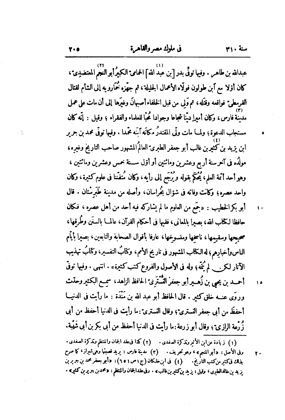 عبد الله بن طاهر. وفيها توفّى بدر [بن عبد الله «1» ] الحمامىّ الكبير أبو النجم «2» المعتضدىّ، كان أوّلا مع ابن طولون فولّاه الأعمال الجليلة، ثم جهّزه خمارويه إلى الشأم لقتال القرمطىّ فواقعه وقتله، ثم ولى من قبل الخلفاء أصبهان وغيرها إلى أن مات على عمل مدينة «3» فارس، وكان أميرا ديّنا شجاعا وجوادا محبّا للعلماء والفقراء؛ وقيل: إنّه كان مستجاب الدعوة؛ ولما مات ولّى المقتدر مكانه ابنه محمّدا. وفيها توفّى محمد بن جرير ابن يزيد بن كثير «4» بن غالب أبو جعفر الطبرىّ العالم المشهور صاحب التاريخ وغيره، مولده في آخر سنة أربع وعشرين ومائتين أو أوّل سنة خمس وعشرين ومائتين، وهو أحد أئمة العلم، يحكم بقوله ويرجع إلى رأيه، وكان متفنّنا في علوم كثيرة، وكان واحد عصره؛ وكانت وفاته في شوّال بخراسان، وأصله من مدينة طبرستان. قال أبو بكر الخطيب: «جمع من العلوم ما لم يشاركه فيه أحد من أهل عصره، فكان حافظا لكتاب الله، بصيرا بالمعانى، فقيها في أحكام القرآن، عالما بالسنن وطرقها، صحيحها وسقيمها، ناسخها ومنسوخها، عارفا بأقوال الصحابة والتابعين، بصيرا بأيّام الناس وأخبارهم؛ له الكتاب المشهور في تاريخ الأمم، وكتاب التفسير، وكتاب تهذيب الآثار لكن لم يتمّه؛ وله في الأصول والفروع كتب كثيرة» . انتهى. وفيها توفّى أحمد بن يحيى بن زهير أبو جعفر التسترىّ الحافظ الزاهد، سمع الكثير وحدّث وروى عنه خلق كثير. قال الحافظ أبو عبد الله بن مندة: ما رأيت في الدنيا أحفظ من أبى جعفر التسترىّ؛ وقال التسترىّ: ما رأيت في الدنيا أحفظ من أبى زرعة الرازىّ؛ وقال أبو زرعة: ما رأيت في الدنيا أحفظ من أبى بكر بن أبى شيبة.