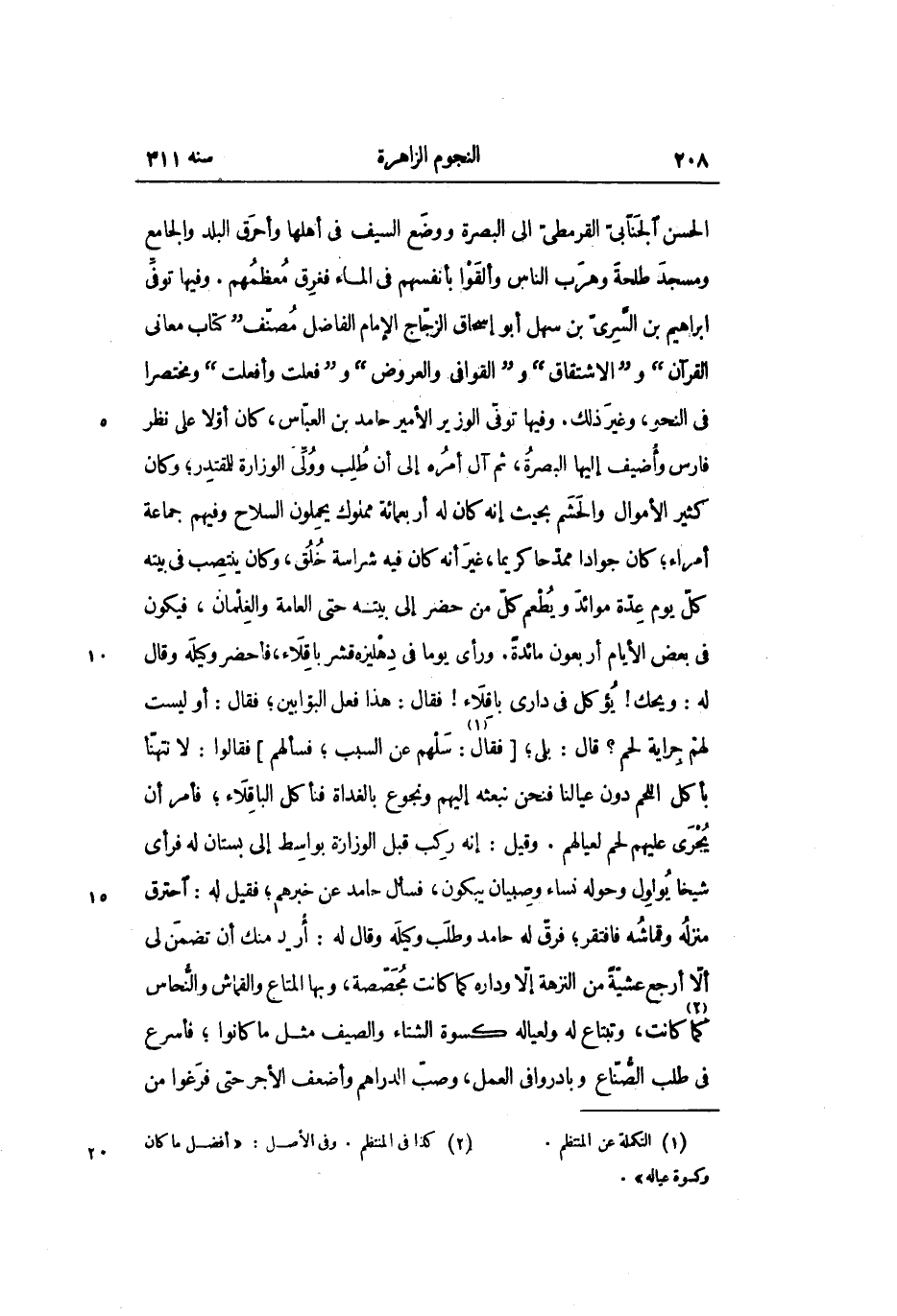 الحسن الجنّابىّ القرمطىّ الى البصرة ووضع السيف في أهلها وأحرق البلد والجامع ومسجد طلحة وهرب الناس وألقوا بأنفسهم في الماء فغرق معظمهم. وفيها توفّى ابراهيم بن السّرىّ بن سهل أبو إسحاق الزجّاج الإمام الفاضل مصنّف" كتاب معانى القرآن" و" الاشتقاق" و" القوافى والعروض" و" فعلت وأفعلت" ومختصرا فى النحو، وغير ذلك. وفيها توفّى الوزير الأمير حامد بن العبّاس، كان أوّلا على نظر فارس وأضيف إليها البصرة، ثم آل أمره إلى أن طلب وولّى الوزارة للمقتدر؛ وكان كثير الأموال والحشم بحيث إنه كان له أربعمائة مملوك يحملون السلاح وفيهم جماعة أمراء؛ كان جوادا ممدّحا كريما، غير أنه كان فيه شراسة خلق، وكان ينتصب في بيته كلّ يوم عدّة موائد ويطعم كلّ من حضر إلى بيته حتى العامة والغلمان، فيكون فى بعض الأيام أربعون مائدة. ورأى يوما في دهليزه قشر باقلاء، فأحضر وكيله وقال له: ويحك! يؤكل في دارى باقلاء! فقال: هذا فعل البوّابين؛ فقال: أو ليست لهم جراية لحم؟ قال: بلى؛ [فقال «1» : سلهم عن السبب؛ فسألهم] فقالوا: لا نتهنّا بأكل اللحم دون عيالنا فنحن نبعثه إليهم ونجوع بالغداة فنأكل الباقلاء؛ فأمر أن يجرى عليهم لحم لعيالهم. وقيل: إنه ركب قبل الوزارة بواسط إلى بستان له فرأى شيخا يولول وحوله نساء وصبيان يبكون، فسأل حامد عن خبرهم؛ فقيل له: احترق منزله وقماشه فافتقر؛ فرقّ له حامد وطلب وكيله وقال له: أريد منك أن تضمن لى ألّا أرجع عشيّة من النزهة إلّا وداره كما كانت مجصّصة، وبها المتاع والقماش والنّحاس كما «2» كانت، وتبتاع له ولعياله كسوة الشتاء والصيف مثل ما كانوا؛ فأسرع فى طلب الصّنّاع وبادروا فى العمل، وصبّ الدراهم وأضعف الأجر حتى فرغوا من