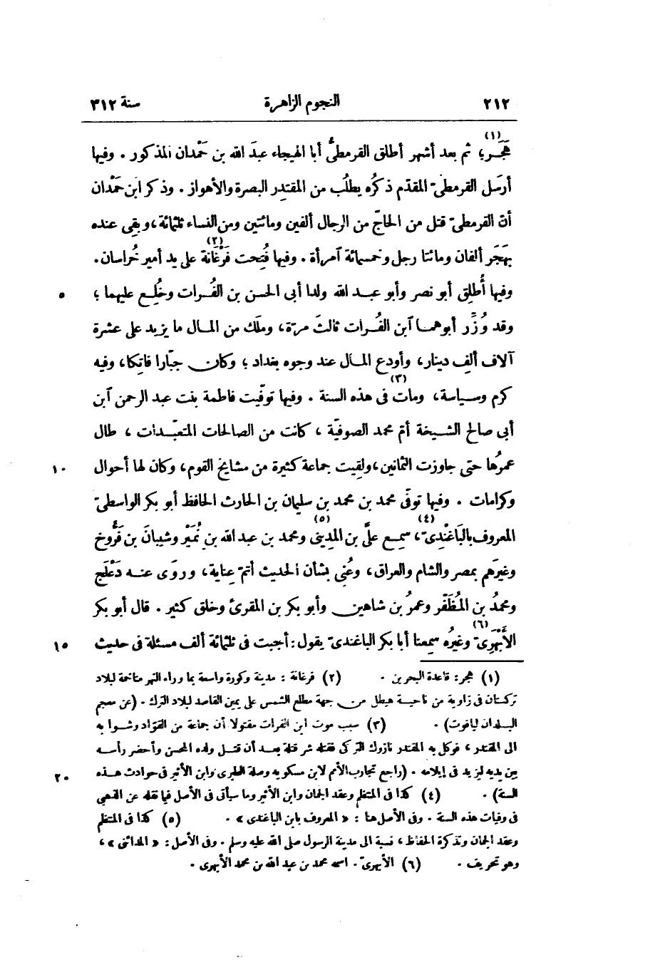 هجر «1» ؛ ثم بعد أشهر أطلق القرمطىّ أبا الهيجاء عبد الله بن حمدان المذكور. وفيها أرسل القرمطىّ المقدّم ذكره يطلب من المقتدر البصرة والأهواز. وذكر ابن حمدان أنّ القرمطىّ قتل من الحاجّ من الرجال ألفين ومائتين ومن النساء ثلثمائة، وبقى عنده بهجر ألفان ومائتا رجل وخمسمائة امرأة. وفيها فتحت فرغانة «2» على يد أمير خراسان.