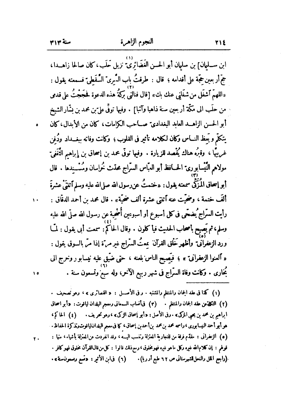 «اللهمّ اشغل من شغلنى عنك بك» [قال فنالنى «2» بركة هذه الدعوة فحججت على قدمى من حلب الى مكّة أربعين سنة ذاهبا وآئبا] . وفيها توفّى علىّ بن محمد بن بشّار الشيخ أبو الحسن الزاهد العابد البغدادىّ صاحب الكرامات، كان من الأبدال، كان يتكلّم ويعظ الناس وكان لكلامه تأثير في القلوب؛ وكانت وفاته ببغداد ودفن غربيّها، وقبره هناك يقصد للزيارة. وفيها توفّى محمد بن إسحاق بن إبراهيم الثّقفىّ مولاهم النّيسابورىّ الحافظ أبو العبّاس السّراج محدّث خراسان ومسندها. قال أبو إسحاق المزكّى «3» سمعته يقول: «ختمت عن رسول الله صلى الله عليه وسلم اثنتى عشرة ألف ختمة، وضحّيت عنه اثنتى عشرة ألف ضحيّة» . قال محمد بن أحمد الدقّاق:
