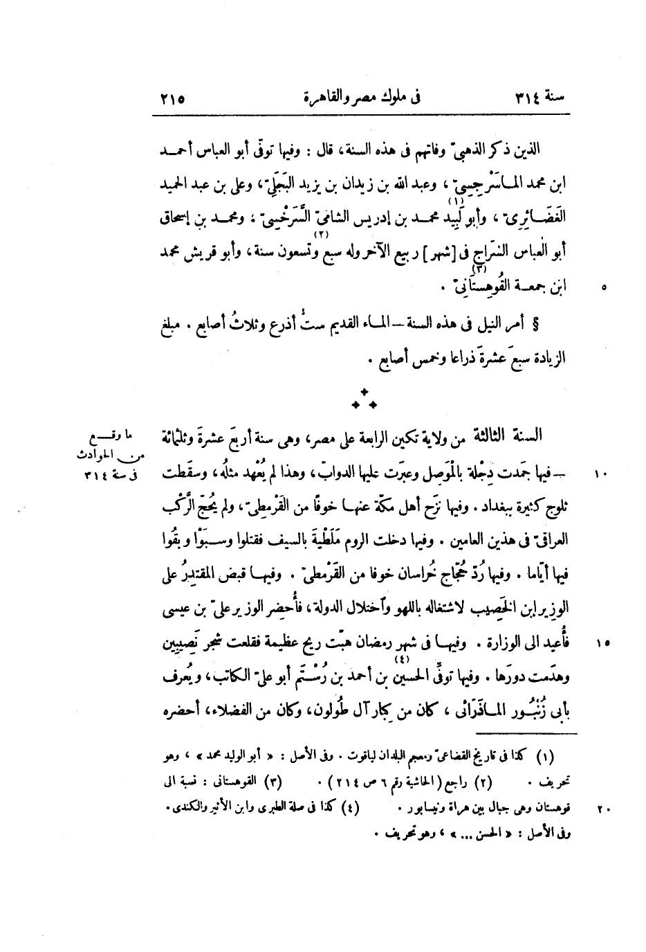 السنة الثالثة من ولاية تكين الرابعة على مصر، وهى سنة أربع عشرة وثلثمائة- فيها جمدت دجلة بالموصل وعبرت عليها الدوابّ، وهذا لم يعهد مثله، وسقطت ثلوج كثيرة ببغداد. وفيها نزح أهل مكّة عنها خوفا من القرمطىّ، ولم يحجّ الرّكب العراقىّ في هذين العامين. وفيها دخلت الروم ملطية بالسيف فقتلوا وسبوا وبقوا فيها أيّاما. وفيها ردّ حجّاج خراسان خوفا من القرمطىّ. وفيها قبض المقتدر على الوزير ابن الخصيب لاشتغاله باللهو واختلال الدولة، فأحضر الوزير علىّ بن عيسى فأعيد الى الوزارة. وفيها في شهر رمضان هبّت ريح عظيمة فقلعت شجر نصيبين وهدمت دورها. وفيها توفّى الحسين «4» بن أحمد بن رستم أبو علىّ الكاتب، ويعرف بأبى زنبور الماذرائى، كان من كبار آل طولون، وكان من الفضلاء، أحضره