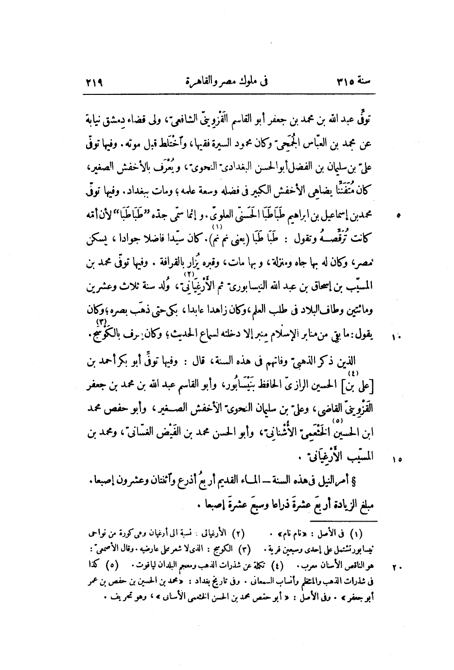 توفّى عبد الله بن محمد بن جعفر أبو القاسم القزوينىّ الشافعىّ، ولى قضاء دمشق نيابة عن محمد بن العبّاس الجمحىّ وكان محمود السيرة فقيها، واختلط قبل موته. وفيها توفّى علىّ بن سليمان بن الفضل أبو الحسن البغدادىّ النحوىّ، ويعرف بالأخفش الصغير، كان متفنّنا يضاهى الأخفش الكبير في فضله وسعة علمه؛ ومات ببغداد. وفيها توفّى محمد بن إسماعيل بن ابراهيم طباطبا الحسنىّ العلوىّ. وإنما سمّى جدّه" طباطبا" لأن أمّه كانت ترقّصه وتقول: طباطبا (يعنى نم نم «1» ) . كان سيّدا فاضلا جوادا، يسكن مصر، وكان له بها جاه ومنزلة، وبها مات، وقبره يزار بالقرافة. وفيها توفّى محمد بن المسيّب بن إسحاق بن عبد الله النيسابورىّ ثم الأرغيانىّ «2» ، ولد سنة ثلاث وعشرين ومائتين وطاف البلاد في طلب العلم، وكان زاهدا عابدا، بكى حتى ذهب بصره؛ وكان يقول: ما بقى من منابر الإسلام منبر إلا دخلته لسماع الحديث؛ وكان يعرف بالكوسج «3» .