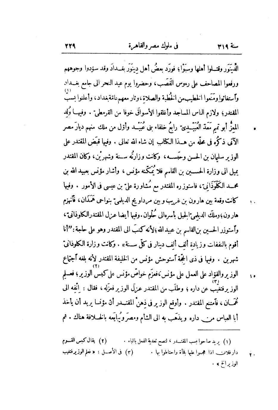 الدّينور وقتلوا أهلها وسبوا؛ فورد بعض أهل دينور بغداد وقد سوّدوا وجوههم ورفعوا المصاحف على رءوس القصب، وحضروا يوم عيد النحر الى جامع بغداد واستغاثوا ومنعوا الخطيب من الخطبة والصلاة، وثار معهم عامّة بغداد، وأعلنوا بسبّ «1» المقتدر؛ ولازم الناس المساجد وأغلقوا الأسواق خوفا من القرمطىّ. وفيها ولد المعزّ أبو تميم معدّ العبيدىّ رابع خلفاء بنى عبيد وأوّل من ملك منهم ديار مصر الآتى ذكره في محلّه من هذا الكتاب إن شاء الله تعالى. وفيها قبض المقتدر على الوزير سليمان بن الحسن وحبسه، وكانت وزارته سنة وشهرين، وكان المقتدر يميل الى وزارة الحسين بن القاسم فلا يمكّنه مؤنس، وأشار مؤنس بعبيد الله بن محمد الكلوذانىّ، فاستوزره المقتدر مع مشاورة علىّ بن عيسى في الأمور. وفيها كانت وقعة بين هارون بن غريب وبين مرداويج الديلمىّ بنواحى همذان، فانهزم هارون؛ وملك الديلمىّ الجبل بأسره الى حلوان. وفيها أيضا عزل المقتدر الكاوذانىّ، واستوزر الحسين بن القاسم بن عبيد الله؛ لأنه كتب الى المقتدر وهو على حاجة:" أنا أقوم بالنففات وزيادة ألف ألف دينار في كلّ سنة". وكانت وزارة الكلوذانىّ شهرين. وفيها في ذى الحجّة استوحش مؤنس من الخليفة المقتدر لأنه بلغه اجتماع الوزير والقوّاد على العمل على مؤنس، فعزم خواصّ مؤنس على كبس «2» الوزير؛ فعلم الوزير فتغيّب «3» عن داره؛ وطلب من المقتدر عزل الوزير فعزله، فقال: انفه الى عمان، فامتنع المقتدر. وأوقع الوزير في ذهن المقتدر أنّ مؤنسا يريد أن يأخذ أبا العباس من داره ويذهب به الى الشأم ومصر ويبايعه بالخلافة هناك. ثم