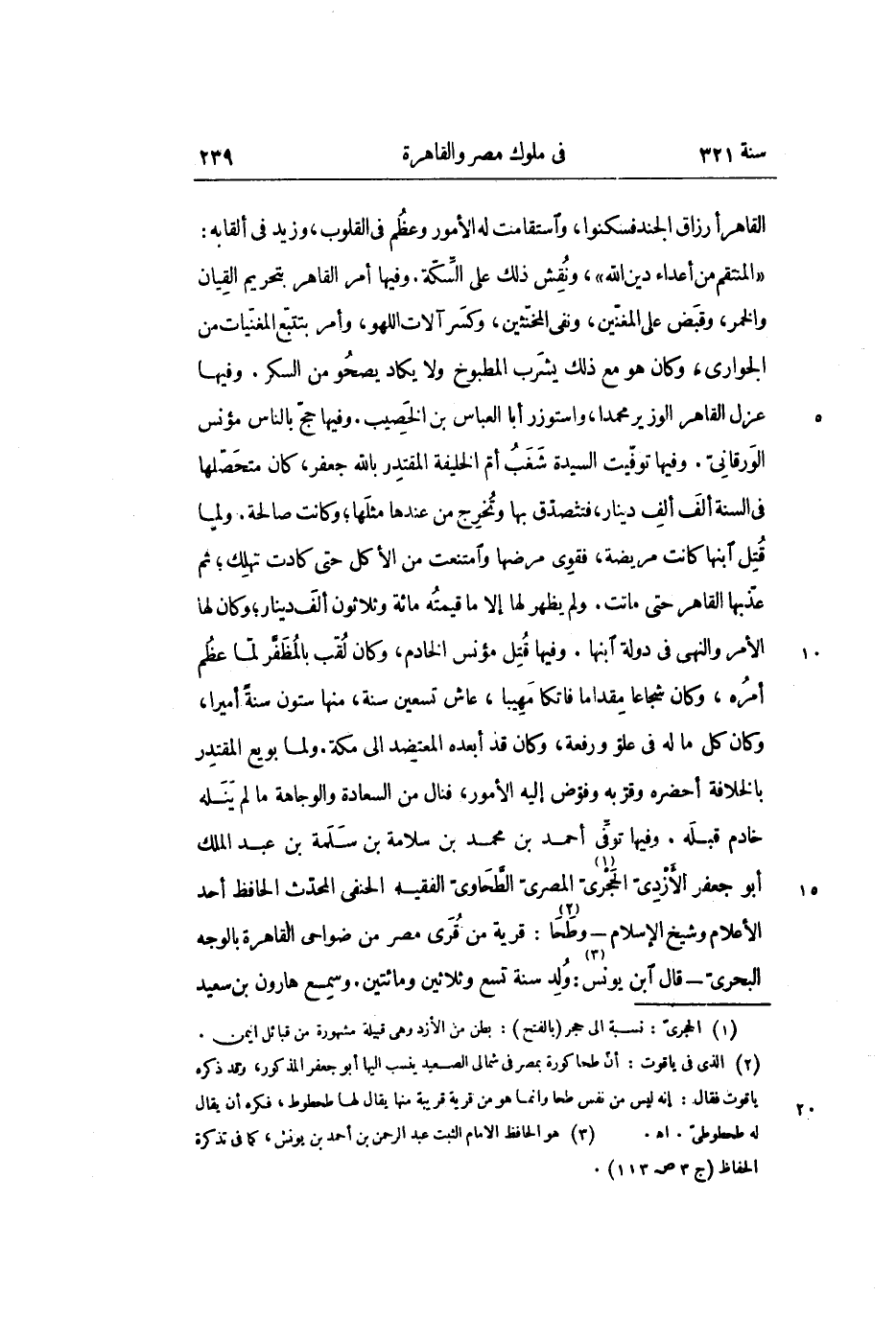 «المنتقم من أعداء دين الله» ، ونقش ذلك على السّكّة. وفيها أمر القاهر بتحريم القيان والخمر، وقبض على المغنّين، ونفى المخنّثين، وكسر آلات اللهو، وأمر بتتبّع المغنّيات من الجوارى، وكان هو مع ذلك يشرب المطبوخ ولا يكاد يصحو من السكر. وفيها عزل القاهر الوزير محمدا، واستوزر أبا العباس بن الخصيب. وفيها حجّ بالناس مؤنس الورقانىّ. وفيها توفّيت السيدة شغب أمّ الخليفة المقتدر بالله جعفر، كان متحصّلها فى السنة ألف ألف دينار، فتتصدّق بها وتخرج من عندها مثلها؛ وكانت صالحة. ولما قتل ابنها كانت مريضة، فقوى مرضها وامتنعت من الأكل حتى كادت تهلك؛ ثم عذّبها القاهر حتى ماتت. ولم يظهر لها إلا ما قيمته مائة وثلاثون ألف دينار؛ وكان لها الأمر والنهى في دولة ابنها. وفيها قتل مؤنس الخادم، وكان لقّب بالمظفّر لمّا عظم أمره، وكان شجاعا مقداما فاتكا مهيبا، عاش تسعين سنة، منها ستون سنة أميرا، وكان كل ما له في علوّ ورفعة، وكان قد أبعده المعتضد الى مكة. ولما بويع المقتدر بالخلافة أحضره وقرّبه وفوّض إليه الأمور، فنال من السعادة والوجاهة ما لم ينله خادم قبله. وفيها توفّى أحمد بن محمد بن سلامة بن سلمة بن عبد الملك أبو جعفر الأزدىّ الحجرىّ «1» المصرىّ الطّحاوىّ الفقيه الحنفى المحدّث الحافظ أحد الأعلام وشيخ الإسلام- وطحا «2» : قرية من قرى مصر من ضواحى القاهرة بالوجه البحرىّ- قال ابن يونس «3» : ولد سنة تسع وثلاثين ومائتين. وسمع هارون بن سعيد