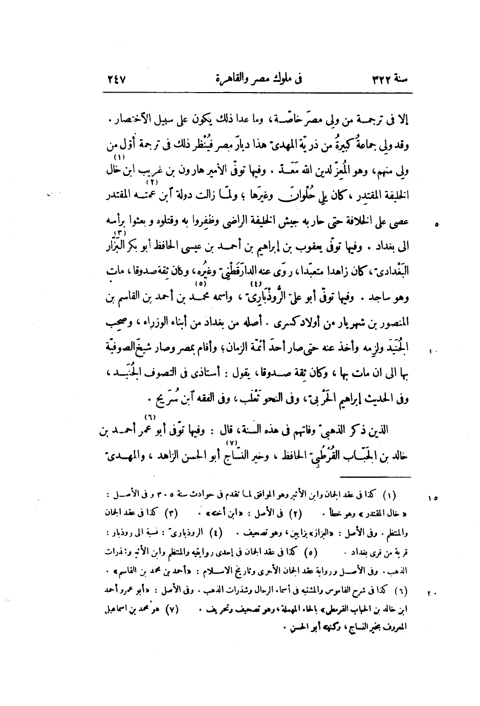 وقد ولى جماعة كبيرة من ذريّة المهدىّ هذا ديار مصر فينظر ذلك في ترجمة أوّل من ولى منهم، وهو المعزّ لدين الله معدّ. وفيها توفّى الأمير هارون بن غريب ابن «1» خال الخليفة المقتدر، كان يلى حلوان وغيرها؛ ولمّا زالت دولة ابن «2» عمته المقتدر عصى على الخلافة حتى حاربه جيش الخليفة الراضى وظفروا به وقتلوه وبعثوا برأسه الى بغداد. وفيها توفّى يعقوب بن إبراهيم بن أحمد بن عيسى الحافظ أبو بكر «3» البزّار البغدادىّ، كان زاهدا متعبّدا، روى عنه الدارقطنىّ وغيره، وكان ثقة صدوقا، مات وهو ساجد. وفيها توفّى أبو علىّ الرّوذبارىّ «4» ، واسمه محمد «5» بن أحمد بن القاسم بن المنصور بن شهريار من أولاد كسرى. أصله من بغداد من أبناء الوزراء، وصحب الجنيد ولزمه وأخذ عنه حتى صار أحد أئمّة الزمان؛ وأقام بمصر وصار شيخ الصوفيّة بها الى ان مات بها، وكان ثقة صدوقا، يقول: أستاذى في التصوف الجنيد، وفي الحديث إبراهيم الحربىّ، وفي النحو ثعلب، وفي الفقه ابن سريج.