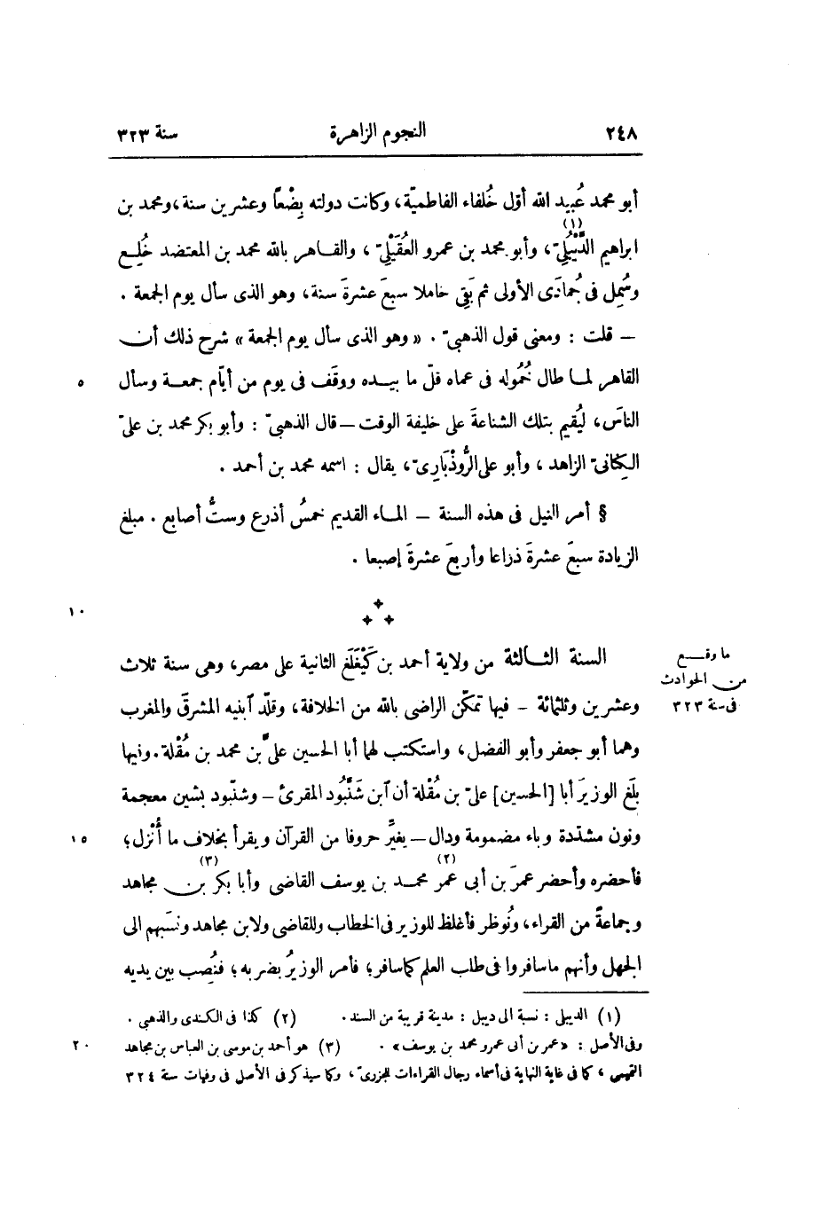 السنة الثالثة من ولاية أحمد بن كيغلغ الثانية على مصر، وهى سنة ثلاث وعشرين وثلثمائة- فيها تمكّن الراضى بالله من الخلافة، وقلّد ابنيه المشرق والمغرب وهما أبو جعفر وأبو الفضل، واستكتب لهما أبا الحسين علىّ بن محمد بن مقلة. وفيها بلغ الوزير أبا [الحسين] علىّ بن مقلة أن ابن شنّبود المقرئ- وشنّبود بشين معجمة ونون مشدّدة وباء مضمومة ودال- بغيّر حروفا من القرآن ويقرأ بخلاف ما أنزل؛ فأحضره وأحضر عمر بن أبى عمر «2» محمد بن يوسف القاضى وأبا بكر «3» بن مجاهد وجماعة من القراء، ونوظر فأغلظ للوزير في الخطاب وللقاضى ولابن مجاهد ونسبهم الى الجهل وأنهم ما سافروا في طلب العلم كما سافر؛ فأمر الوزير بضربه؛ فنصب بين يديه