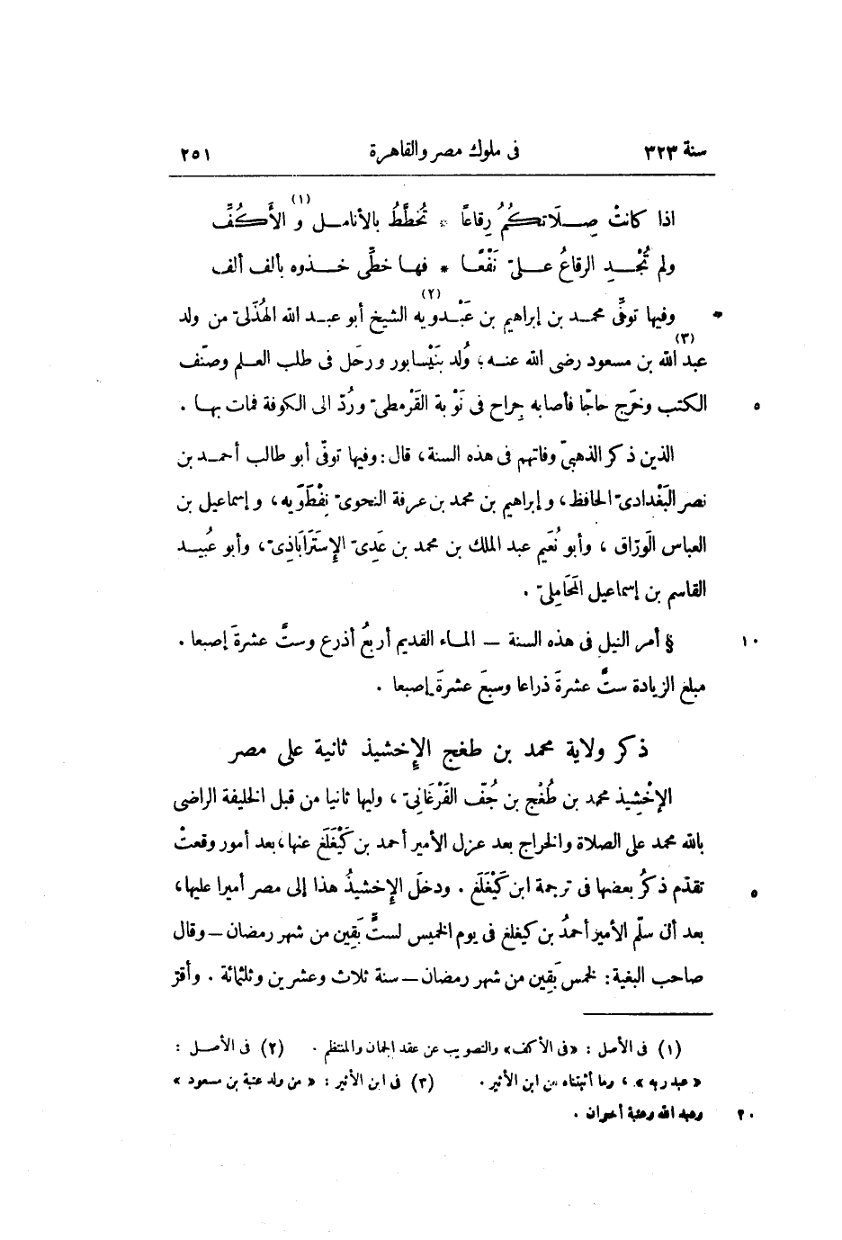 الإخشيذ محمد بن طغج بن جفّ الفرغانىّ، وليها ثانيا من قبل الخليفة الراضى بالله محمد على الصلاة والخراج بعد عزل الأمير أحمد بن كيغلغ عنها، بعد أمور وقعت تقدّم ذكر بعضها في ترجمة ابن كيغلغ. ودخل الإخشيذ هذا إلى مصر أميرا عليها، بعد أن سلّم الأمير أحمد بن كيغلغ في يوم الخميس لستّ بقين من شهر رمضان- وقال صاحب البغية: لخمس بقين من شهر رمضان- سنة ثلاث وعشرين وثلثمائة. وأقرّ