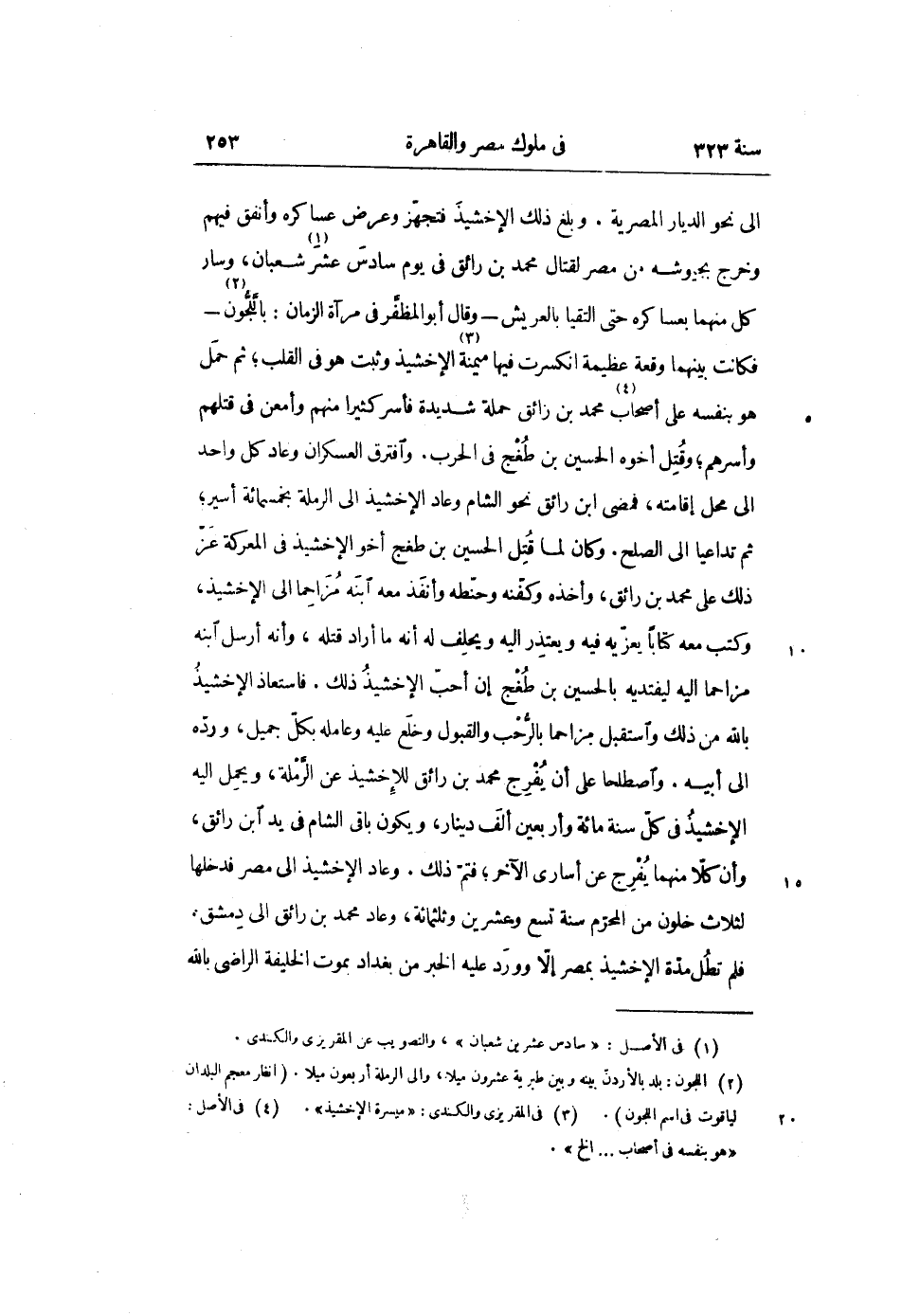 الى نحو الديار المصرية. وبلغ ذلك الإخشيذ فتجهّز وعرض عساكره وأنفق فيهم وخرج بجيوشه من مصر لقتال محمد بن رائق في يوم سادس عشر «1» شعبان، وسار كل منهما بعساكره حتى التقيا بالعريش- وقال أبو المظفّر في مرآة الزمان: باللّجّون «2» - فكانت بينهما وقعة عظيمة انكسرت فيها ميمنة «3» الإخشيذ وثبت هو في القلب؛ ثم حمل هو بنفسه على أصحاب «4» محمد بن زائق حملة شديدة فأسر كثيرا منهم وأمعن في قتلهم وأسرهم؛ وقتل أخوه الحسين بن طغج في الحرب. وافترق العسكران وعاد كل واحد الى محل إقامته، فمضى ابن رائق نحو الشام وعاد الإخشيذ الى الرملة بخمسمائة أسير؛ ثم تداعيا الى الصلح. وكان لما قتل الحسين بن طغج أخو الإخشيذ في المعركة عزّ ذلك على محمد بن رائق، وأخذه وكفّنه وحنّطه وأنفذ معه ابنه مزاحما الى الإخشيذ، وكتب معه كتابا يعزّيه فيه ويعتذر إليه ويحلف له أنه ما أراد قتله، وأنه أرسل ابنه مزاحما إليه ليفتديه بالحسين بن طغج إن أحبّ الإخشيذ ذلك. فاستعاذ الإخشيذ بالله من ذلك واستقبل مزاحما بالرّحب والقبول وخلع عليه وعامله بكلّ جميل، وردّه الى أبيه. واصطلحا على أن يفرج محمد بن رائق للإخشيذ عن الرّملة، ويحمل إليه الإخشيذ في كلّ سنة مائة وأربعين ألف دينار، ويكون باقى الشام في يد ابن رائق، وأن كلّا منهما يفرج عن أسارى الآخر؛ فتمّ ذلك. وعاد الإخشيذ الى مصر فدخلها لثلاث خلون من المحرّم سنة تسع وعشرين وثلثمائة، وعاد محمد بن رائق الى دمشق، فلم تطل مدّة الإخشيذ بمصر إلّا وورد عليه الخبر من بغداد بموت الخليفة الراضى بالله