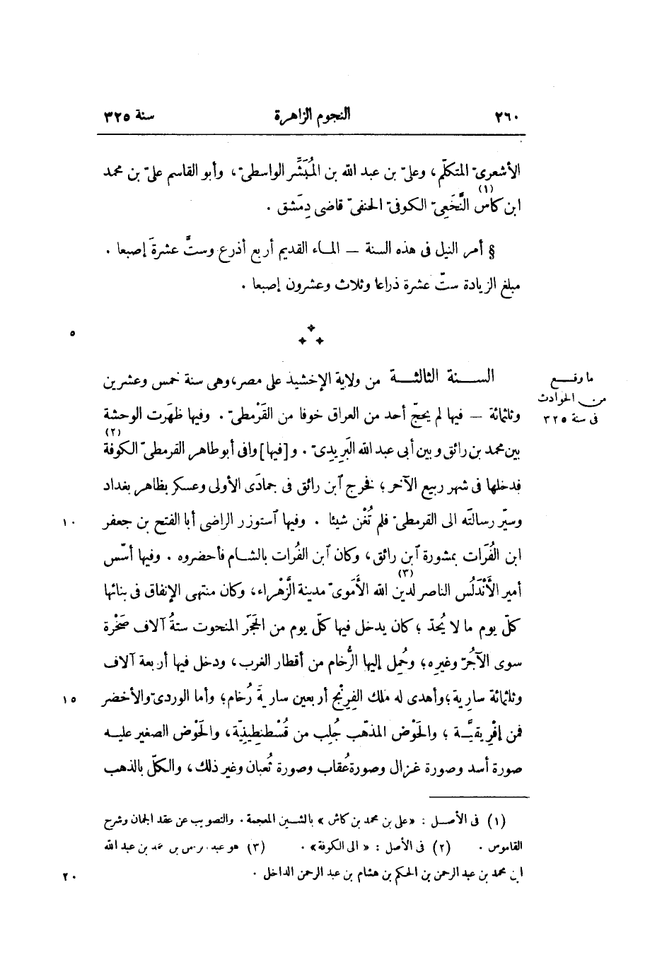 السنة الثالثة من ولاية الإخشيذ على مصر، وهى سنة خمس وعشرين وثلثمائة- فيها لم يحجّ أحد من العراق خوفا من القرمطىّ. وفيها ظهرت الوحشة بين محمد بن رائق وبين أبى عبد الله البريدىّ. و [فيها] وافى أبو طاهر القرمطىّ الكوفة «2» فدخلها في شهر ربيع الآخر؛ فخرج ابن رائق في جمادى الأولى وعسكر بظاهر بغداد وسيّر رسالته الى القرمطىّ فلم تغن شيئا. وفيها استوزر الراضى أبا الفتح بن جعفر ابن الفرات بمشورة ابن رائق، وكان ابن الفرات بالشام فأحضروه. وفيها أسّس أمير الأندلس الناصر لدين «3» الله الأموىّ مدينة الزّهراء، وكان منتهى الإنفاق في بنائها كلّ يوم ما لا يحدّ؛ كان يدخل فيها كلّ يوم من الحجر المنحوت ستة آلاف صخرة سوى الآجرّ وغيره؛ وحمل إليها الرّخام من أقطار الغرب، ودخل فيها أربعة آلاف وثلثمائة سارية؛ وأهدى له ملك الفرنج أربعين سارية رخام؛ وأما الوردىّ والأخضر فمن إفريقيّة؛ والحوض المذهّب جلب من قسطنطينيّة، والحوض الصغير عليه صورة أسد وصورة غزال وصورة عقاب وصورة ثعبان وغير ذلك، والكلّ بالذهب