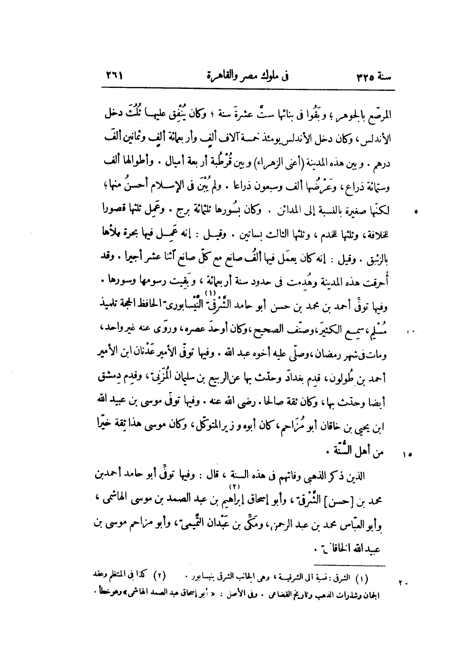 وفيها توفّى أحمد بن محمد بن حسن أبو حامد الشّرقىّ «1» النّيسابورىّ الحافظ الحجة تلميذ مسلم، سمع الكثير، وصنّف الصحيح، وكان أوحد عصره، وروى عنه غير واحد، ومات في شهر رمضان، وصلّى عليه أخوه عبد الله. وفيها توفّى الأمير عدنان ابن الأمير أحمد بن طولون، قدم بغداد وحدّث بها عن الربيع بن سليمان المزنىّ، وقدم دمشق أيضا وحدّث بها، وكان ثقة صالحا. رضى الله عنه. وفيها توفّى موسى بن عبيد الله ابن يحيى بن خاقان أبو مزاحم، كان أبوه وزير المتوكّل، وكان موسى هذا ثقة خيّرا من أهل السّنّة.
