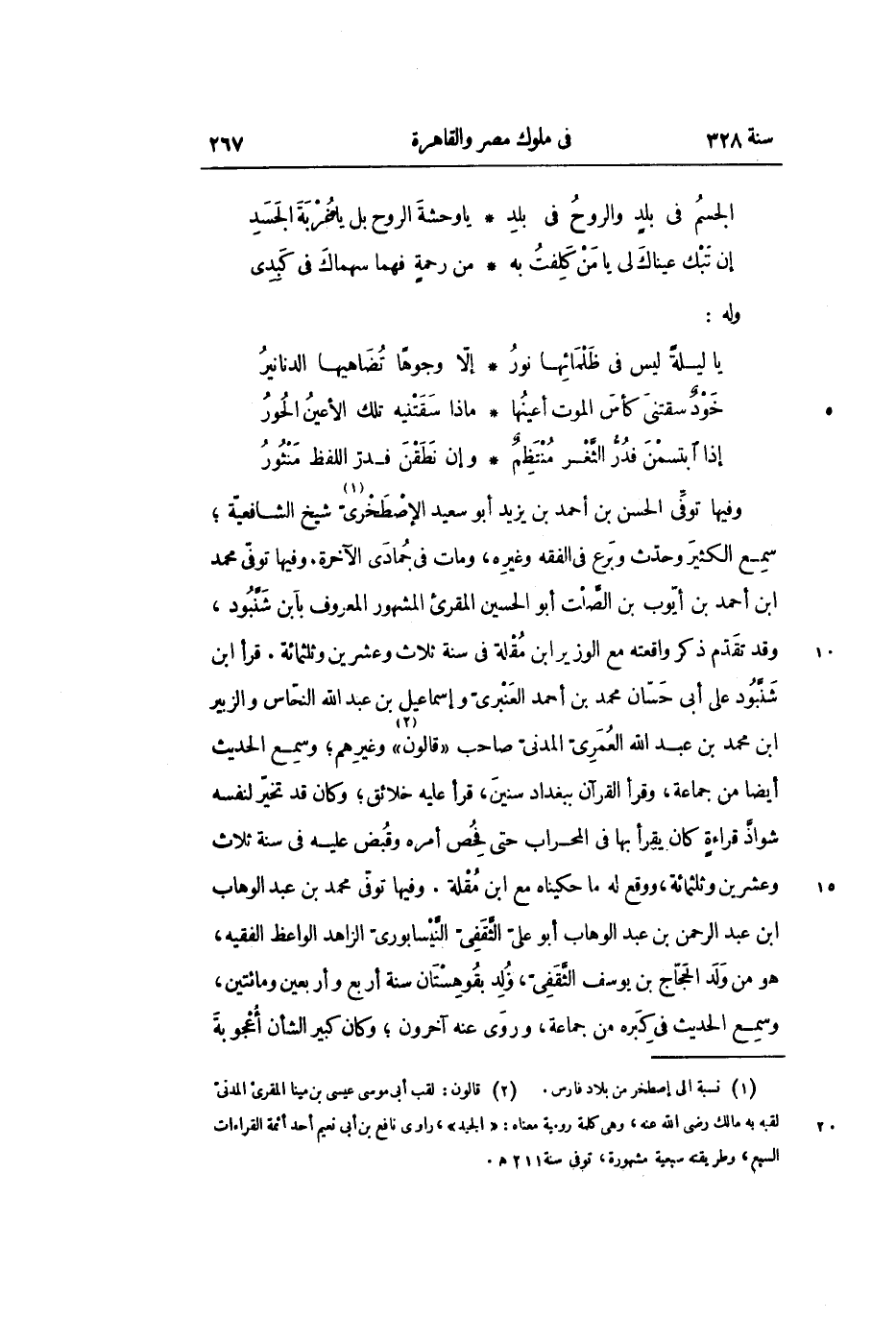 وفيها توفّى الحسن بن أحمد بن يزيد أبو سعيد الإصطخرىّ «1» شيخ الشافعيّة؛ سمع الكثير وحدّث وبرع في الفقه وغيره، ومات في جمادى الآخرة. وفيها توفّى محمد ابن أحمد بن أيّوب بن الصّلت أبو الحسين المقرئ المشهور المعروف بابن شنّبود، وقد تقدّم ذكر واقعته مع الوزير ابن مقلة في سنة ثلاث وعشرين وثلثمائة. قرأ ابن شنّبود على أبى حسّان محمد بن أحمد العنبرىّ وإسماعيل بن عبد الله النحّاس والزبير ابن محمد بن عبد الله العمرىّ المدنىّ صاحب «قالون «2» » وغيرهم؛ وسمع الحديث أيضا من جماعة، وقرأ القرآن ببغداد سنين، قرأ عليه خلائق؛ وكان قد تخيّر لنفسه شواذ قراءة كان يقرأ بها في المحراب حتى فحص أمره وقبض عليه في سنة ثلاث وعشرين وثلثمائة، ووقع له ما حكيناه مع ابن مقلة. وفيها توفّى محمد بن عبد الوهاب ابن عبد الرّحمن بن عبد الوهاب أبو علىّ الثّقفىّ النّيسابورىّ الزاهد الواعظ الفقيه، هو من ولد الحجّاج بن يوسف الثّقفىّ، ولد بقوهستان سنة أربع وأربعين ومائتين، وسمع الحديث في كبره من جماعة، وروى عنه آخرون؛ وكان كبير الشأن أعجوبة