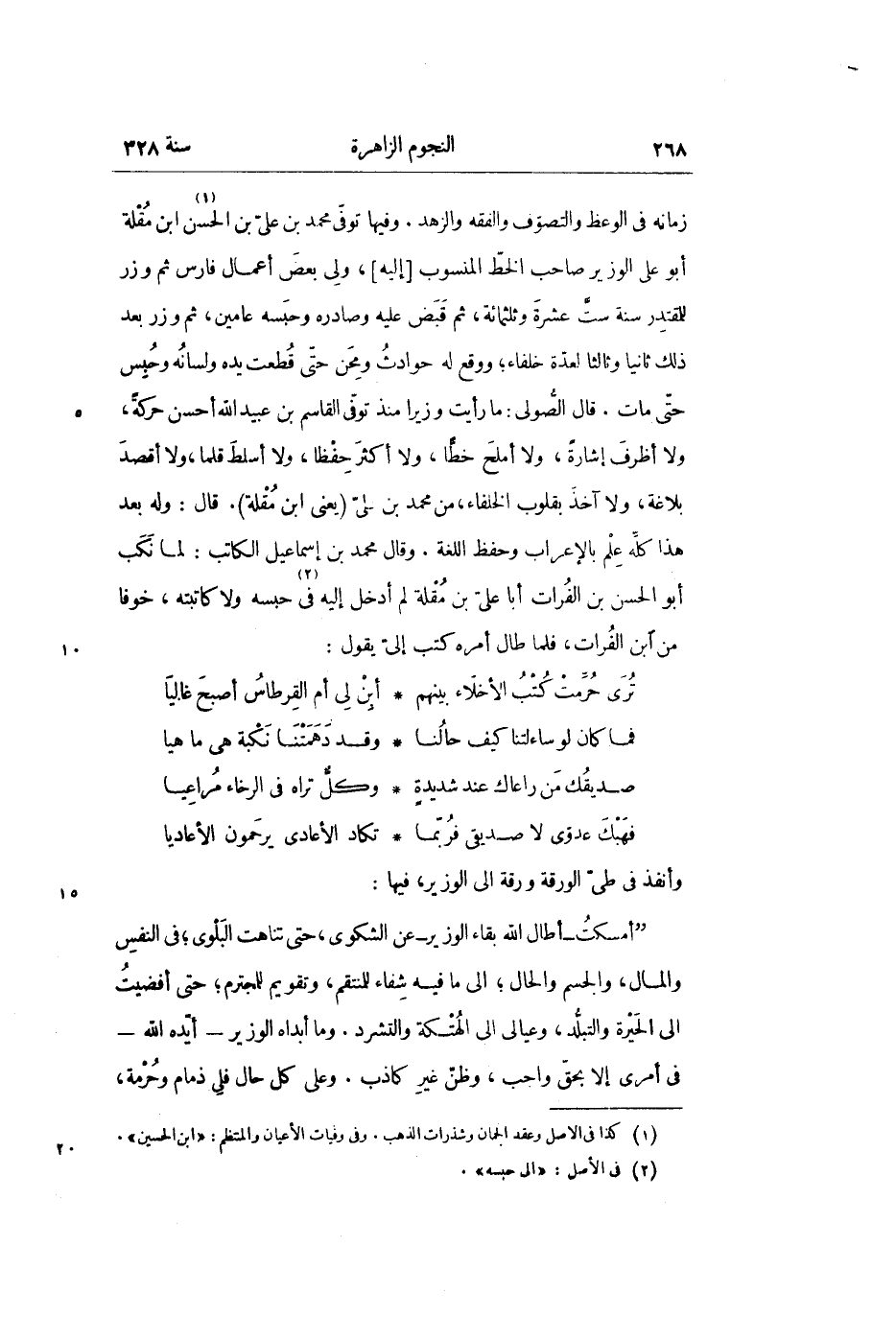 زمانه في الوعظ والتصوّف والفقه والزهد. وفيها توفّى محمد بن علىّ بن الحسن «1» ابن مقلة أبو على الوزير صاحب الخطّ المنسوب [إليه] ، ولى بعض أعمال فارس ثم وزر للمقتدر سنة ستّ عشرة وثلثمائة، ثم قبض عليه وصادره وحبسه عامين، ثم وزر بعد ذلك ثانيا وثالثا لعدّة خلفاء؛ ووقع له حوادث ومحن حتّى قطعت يده ولسانه وحبس حتّى مات. قال الصّولى: ما رأيت وزيرا منذ توفّى القاسم بن عبيد الله أحسن حركة، ولا أظرف إشارة، ولا أملح خطّا، ولا أكثر حفظا، ولا أسلط قلما، ولا أقصد بلاغة، ولا آخذ بقلوب الخلفاء، من محمد بن علىّ (يعنى ابن مقلة) . قال: وله بعد هذا كلّه علم بالإعراب وحفظ اللغة. وقال محمد بن إسماعيل الكاتب: لما نكب أبو الحسن بن الفرات أبا علىّ بن مقلة لم أدخل إليه في «2» حبسه ولا كاتبته، خوفا من ابن الفرات، فلما طال أمره كتب إلىّ يقول: