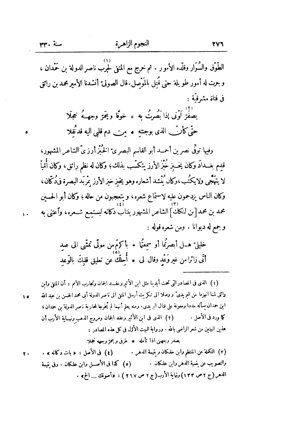 وفيها توفّى نصر بن أحمد أبو القاسم البصرىّ الخبز أرزىّ الشاعر المشهور، قدم بغداد وكان يخبز خبز الأرز يتكسّب بذلك؛ وكان له نظم رائق، وكان أمّيّا لا يتهجّى ولا يكتب، وكان ينشد أشعاره وهو يخبز خبز الأرز بمربد البصرة في دكّان، وكان الناس يزدحمون عليه لاسمّاع شعره، ويتعجبون من حاله؛ وكان أبو الحسين محمد بن محمد [بن لنكك «3» ] الشاعر المشهور ينتاب «4» دكانه ليستمع شعره، واعتنى به وجمع له ديوانا. ومن شعره قوله: