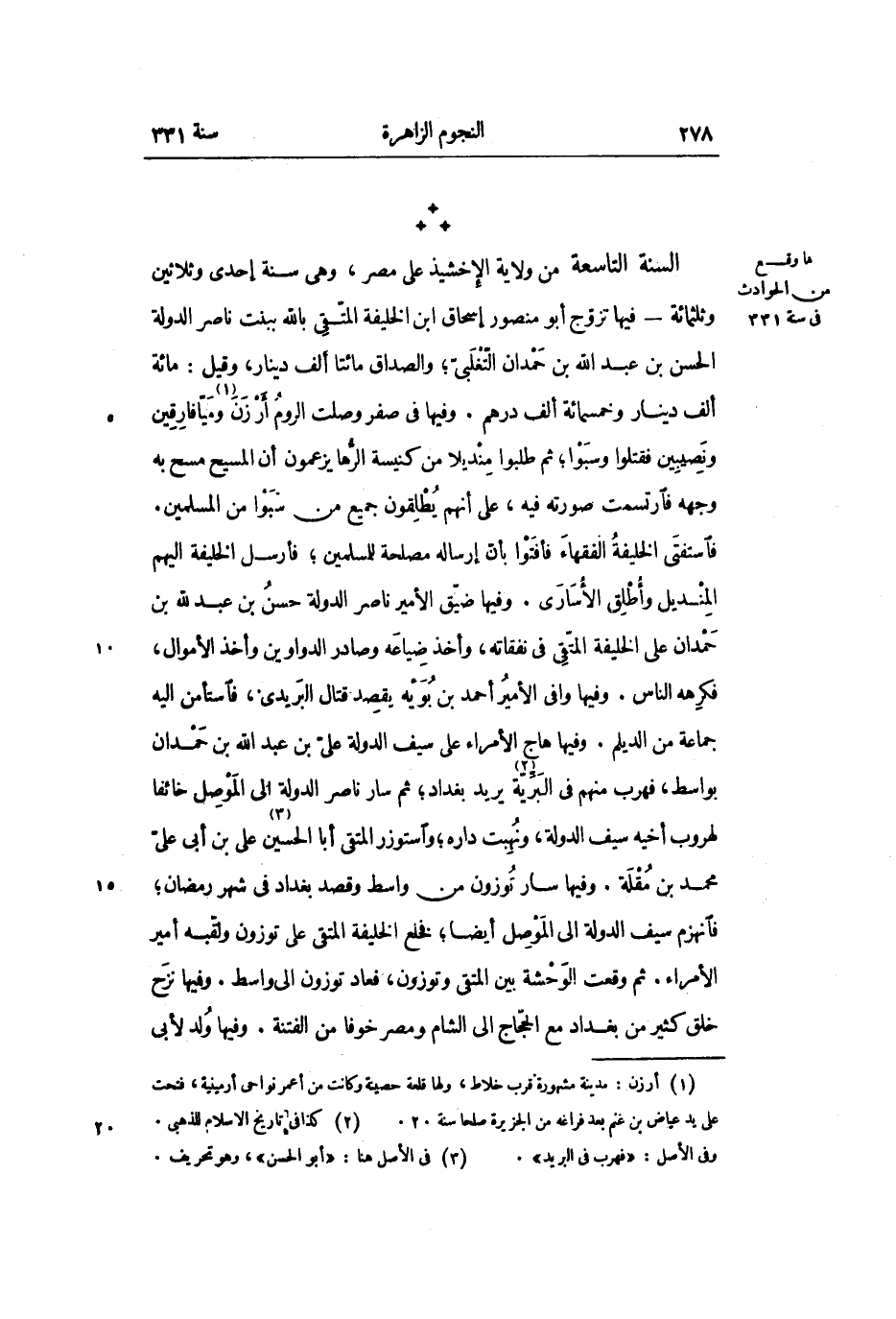 فاستفتى الخليفة الفقهاء فأفتوا بأنّ إرساله مصلحة للمسلمين؛ فأرسل الخليفة اليهم المنديل وأطلق الأسارى. وفيها ضيّق الأمير ناصر الدولة حسن بن عبد الله بن حمدان على الخليفة المتّقى في نفقاته، وأخذ ضياعه وصادر الدواوين وأخذ الأموال، فكرهه الناس. وفيها وافى الأمير أحمد بن بويه يقصد قتال البريدى، فاستأمن إليه جماعة من الديلم. وفيها هاج الأمراء على سيف الدولة علىّ بن عبد الله بن حمدان بواسط، فهرب منهم في البرّيّة «2» يريد بغداد؛ ثم سار ناصر الدولة الى الموصل خائفا لهروب أخيه سيف الدولة، ونهبت داره؛ واستوزر المتقى أبا الحسين «3» على بن أبى علىّ محمد بن مقلة. وفيها سار توزون من واسط وقصد بغداد في شهر رمضان؛ فانهزم سيف الدولة الى الموصل أيضا؛ فخلع الخليفة المتقى على توزون ولقّبه أمير الأمراء. ثم وقعت الوحشة بين المتقى وتوزون، فعاد توزون الى واسط. وفيها نزح خلق كثير من بغداد مع الحجّاج الى الشام ومصر خوفا من الفتنة. وفيها ولد لأبى