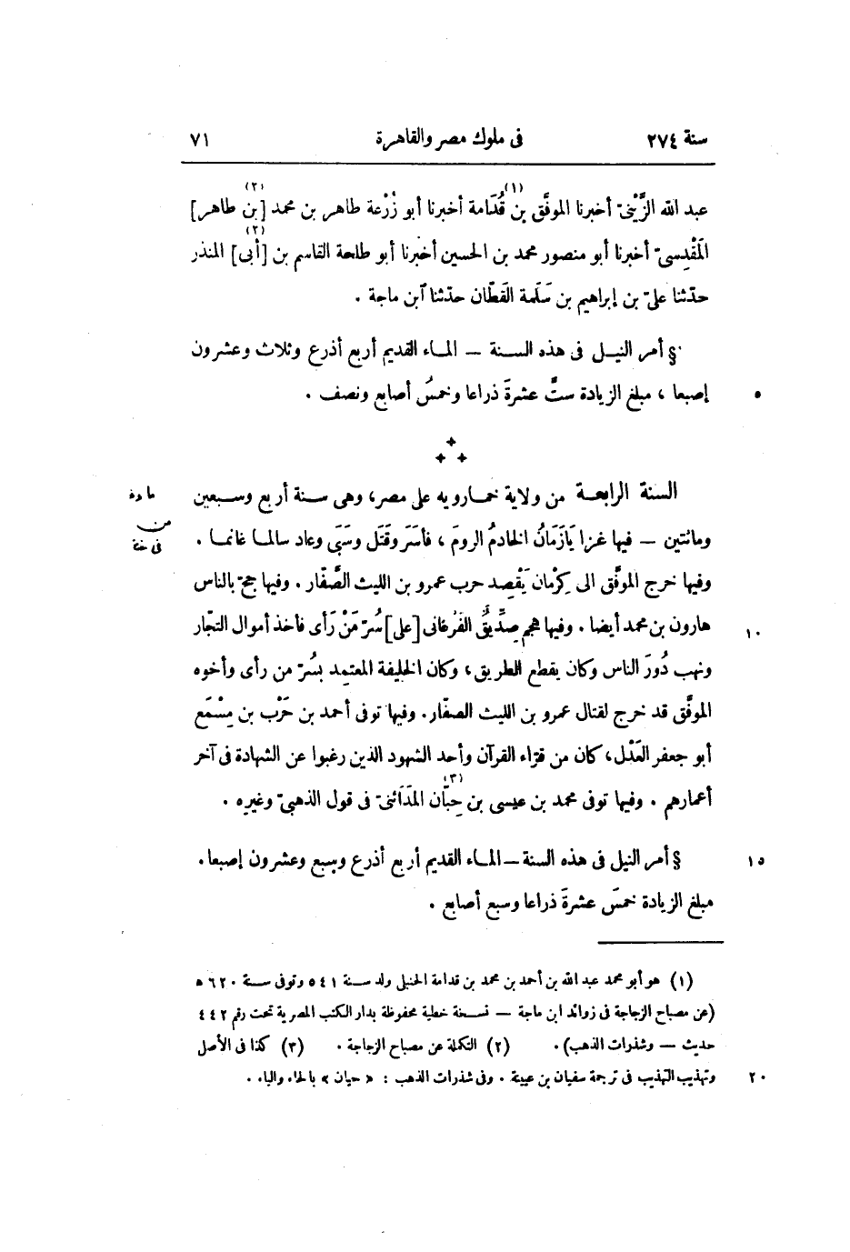 عبد الله الزّينىّ أخبرنا الموفّق بن «1» قدامة أخبرنا أبو زرعة طاهر بن محمد [بن «2» طاهر] المقدسىّ أخبرنا أبو منصور محمد بن الحسين أخبرنا أبو طلحة القاسم بن [أبى «3» ] المنذر حدّثنا علىّ بن إبراهيم بن سلمة القطّان حدّثنا ابن ماجة.