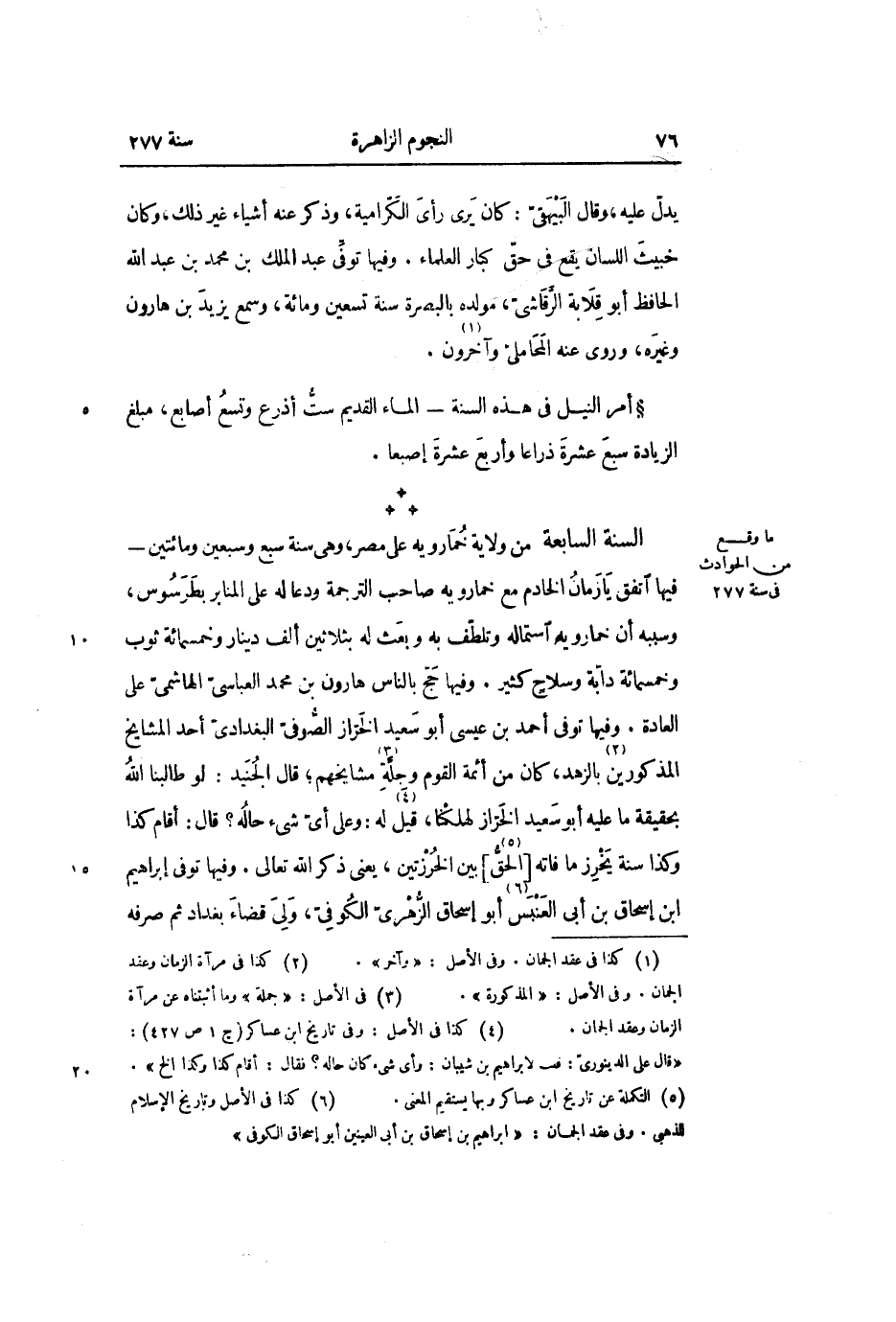 السنة السابعة من ولاية خمارويه على مصر، وهى سنة سبع وسبعين ومائتين- فيها اتفق يا زمان الخادم مع خمارويه صاحب الترجمة ودعا له على المنابر بطرسوس، وسببه أن خمارويه استماله وتلطّف به وبعث له بثلاثين ألف دينار وخمسمائة ثوب وخمسمائة دابّة وسلاح كثير. وفيها حجّ بالناس هارون بن محمد العباسىّ الهاشمىّ على العادة. وفيها توفى أحمد بن عيسى أبو سعيد الخرّاز الصّوفىّ البغدادىّ أحد المشايخ المذكورين «2» بالزهد، كان من أئمة القوم وجلّة «3» مشايخهم؛ قال الجنيد: لو طالبنا الله بحقيقة ما عليه أبو سعيد الخرّاز لهلكنا، قيل «4» له: وعلى أىّ شىء حاله؟ قال: أقام كذا وكذا سنة يخرز ما فاته [الحقّ «5» ] بين الخرزتين، يعنى ذكر الله تعالى. وفيها توفى إبراهيم ابن إسحاق بن أبى العنبس «6» أبو إسحاق الزّهرىّ الكوفىّ، ولى قضاء بغداد ثم صرفه