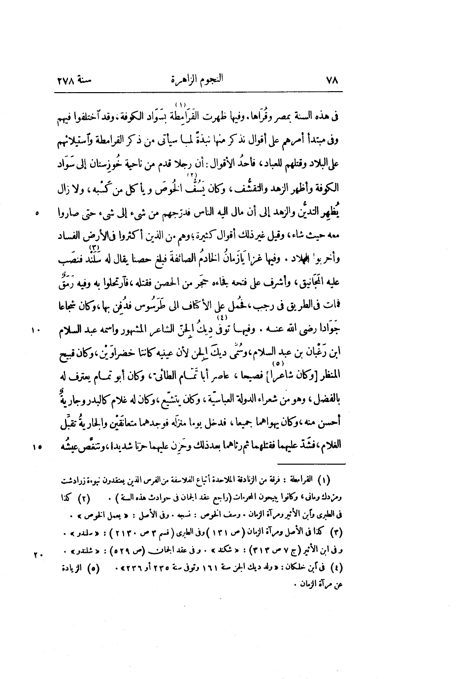 فى هذه السنة بمصر وقراها. وفيها ظهرت القرامطة «1» بسواد الكوفة، وقد اختلفوا فيهم وفي مبتدأ أمرهم على أقوال نذكر منها نبذة لما سيأتى من ذكر القرامطة واستيلائهم على البلاد وقتلهم للعباد، فأحد الأقوال: أن رجلا قدم من ناحية خوزستان إلى سواد الكوفة وأظهر الزهد والتقشّف، وكان يسفّ «2» الخوص ويأكل من كسبه، ولا زال يظهر التديّن والزهد إلى أن مال إليه الناس فدرّجهم من شىء إلى شىء حتى صاروا معه حيث شاء، وقيل غير ذلك أقوال كثيرة؛ وهم من الذين أكثروا في الأرض الفساد وأخربوا البلاد. وفيها غزا يا زمان الخادم الصائفة فبلغ حصنا يقال له سلند «3» فنصب عليه المجانيق، وأشرف على فتحه فجاءه حجر من الحصن فقتله، فارتحلوا به وفيه رمق فمات في الطريق في رجب، فحمل على الأكتاف الى طرسوس فدفن بها، وكان شجاعا جوادا رضى الله عنه. وفيها توفى «4» ديك الجنّ الشاعر المشهور واسمه عبد السلام ابن رغبان بن عبد السلام، وسمّى ديك الجن لأن عينيه كانتا خضراوين، وكان قبيح المنظر [وكان شاعرا «5» ] فصيحا، عاصر أبا تمّام الطائىّ، وكان أبو تمام يعترف له بالفضل، وهو من شعراء الدولة العباسيّة، وكان يتشيّع، وكان له غلام كالبدر وجارية أحسن منه، وكان يهواهما جميعا، فدخل يوما منزله فوجدهما متعانقين والجارية تقبّل الغلام، فشدّ عليهما فقتلهما ثم رثاهما بعد ذلك وحزن عليهما حزنا شديدا، وتنغّص عيشه