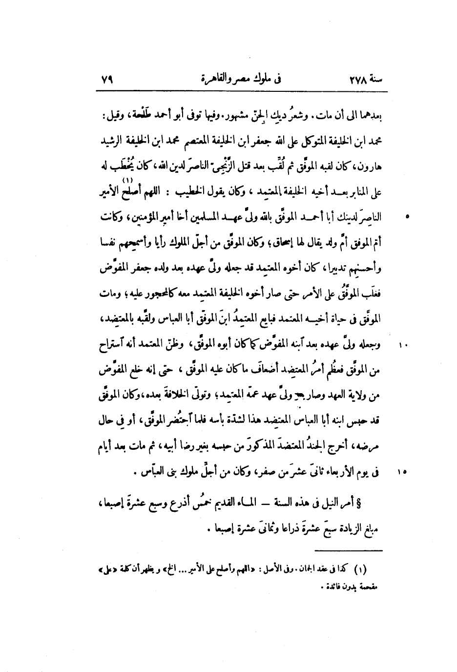 محمد ابن الخليفة المتوكل على الله جعفر ابن الخليفة المعتصم محمد ابن الخليفة الرشيد هارون، كان لقبه الموفّق ثم لقّب بعد قتل الزّنجىّ الناصر لدين الله، كان يخطب له على المنابر بعد أخيه الخليفة المعتمد، وكان يقول الخطيب: اللهم أصلح «1» الأمير الناصر لدينك أبا أحمد الموفّق بالله ولىّ عهد المسلمين أخا أمير المؤمنين، وكانت أمّ الموفق أمّ ولد يقال لها إسحاق؛ وكان الموفّق من أجلّ الملوك رأيا وأسمحهم نفسا وأحسنهم تدبيرا، كان أخوه المعتمد قد جعله ولىّ عهده بعد ولده جعفر المفوّض فغلب الموفّق على الأمر حتى صار أخوه الخليفة المعتمد معه كالمحجور عليه؛ ومات الموفّق في حياة أخيه المعتمد فبايع المعتمد ابن الموفّق أبا العباس ولقّبه بالمعتضد، وجعله ولىّ عهده بعد ابنه المفوّض كما كان أبوه الموفّق، وظنّ المعتمد أنه استراح من الموفّق فعظم أمر المعتضد أضعاف ما كان عليه الموفّق، حتى إنه خلع المفوّض من ولاية العهد وصار ولىّ عهد عمّه المعتمد؛ وتولّى الخلافة بعده، وكان الموفّق قد حبس ابنه أبا العباس المعتضد هذا لشدّة بأسه فلما احتضر الموفّق، أو في حال مرضه، أخرج الجند المعتضد المذكور من حبسه بغير رضا أبيه، ثم مات بعد أيام فى يوم الأربعاء ثانى عشر من صفر، وكان من أجلّ ملوك بنى العبّاس.