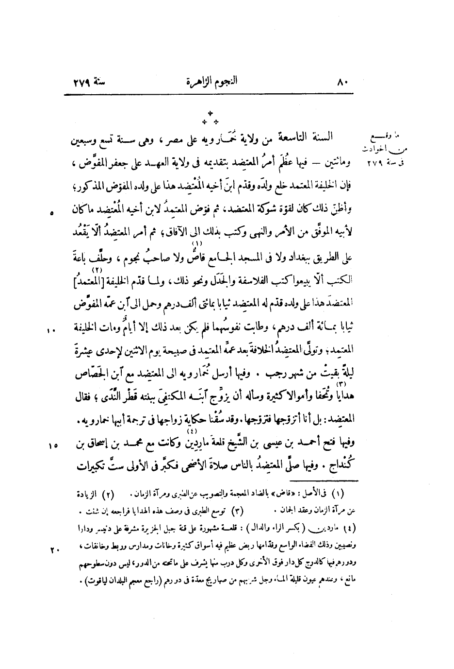 السنة التاسعة من ولاية خمارويه على مصر، وهى سنة تسع وسبعين ومائتين- فيها عظم أمر المعتضد بتقديمه في ولاية العهد على جعفر المفوّض، فإن الخليفة المعتمد خلع ولده وقدّم ابن أخيه المعتضد هذا على ولده المفوّض المذكور؛ وأظنّ ذلك كان لقوّة شوكة المعتضد، ثم فوّض المعتمد لابن أخيه المعتضد ما كان لأبيه الموفّق من الأمر والنهى وكتب بذلك الى الآفاق؛ ثم أمر المعتضد ألّا يقعد على الطريق ببغداد ولا في المسجد الجامع قاصّ «1» ولا صاحب نجوم، وحلّف باعة الكتب ألّا يبيعوا كتب الفلاسفة والجدل ونحو ذلك، ولما قدّم الخليفة [المعتمد «2» ] المعتضد هذا على ولده قدّم له المعتضد ثيابا بمائتى ألف درهم وحمل الى ابن عمّه المفوّض ثيابا بمائة ألف درهم، وطابت نفوسهما فلم يكن بعد ذلك إلا أيام ومات الخليفة المعتمد؛ وتولّى المعتضد الخلافة بعد عمّه المعتمد في صبيحة يوم الاثنين لإحدى عشرة ليلة بقيت من شهر رجب. وفيها أرسل خمارويه الى المعتضد مع ابن الجصّاص هدايا «3» وتحفا وأموالا كثيرة وسأله أن يزوّج ابنه المكتفى ببنته قطر النّدى؛ فقال المعتضد: بل أنا أتزوّجها فتزوّجها. وقد سقنا حكاية زواجها في ترجمة أبيها خمارويه.