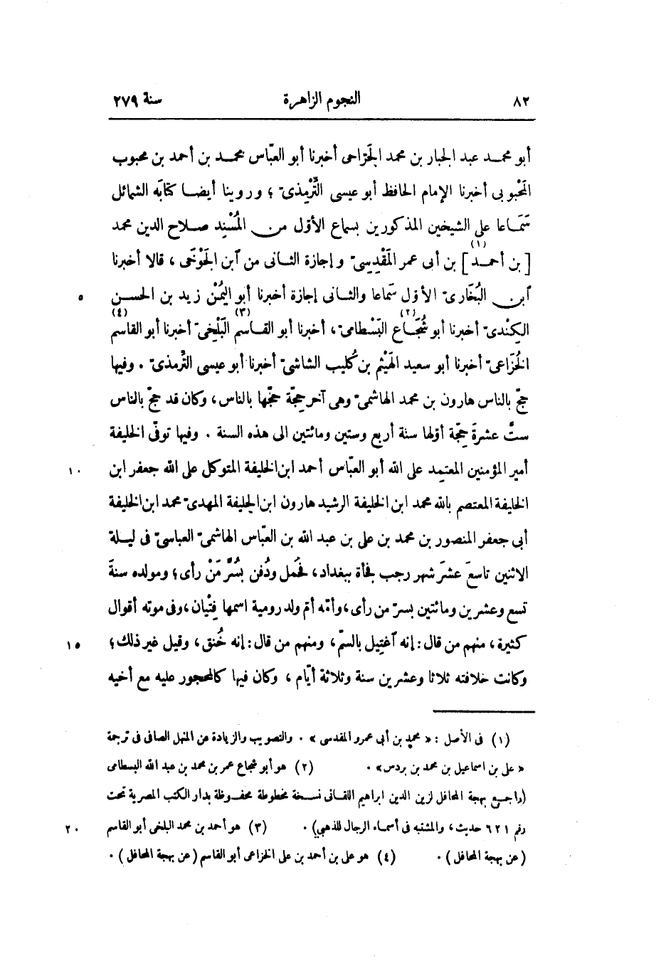 أبو محمد عبد الجبار بن محمد الجرّاحى أخبرنا أبو العبّاس محمد بن أحمد بن محبوب المحبوبى أخبرنا الإمام الحافظ أبو عيسى التّرمذىّ؛ وروينا أيضا كتابه الشمائل سماعا على الشيخين المذكورين بسماع الأوّل من المسند صلاح الدين محمد [بن أحمد «1» ] بن أبى عمر المقدسىّ وإجازة الثانى من ابن الجوخى، قالا أخبرنا ابن البخارىّ الأوّل سماعا والثانى إجازة أخبرنا أبو اليمن زيد بن الحسن الكندىّ أخبرنا أبو شجاع «2» البسطامىّ، أخبرنا أبو القاسم «3» البلخىّ أخبرنا أبو القاسم «4» الخزاعىّ أخبرنا أبو سعيد الهيثم بن كليب الشاشىّ أخبرنا أبو عيسى التّرمذىّ. وفيها حجّ بالناس هارون بن محمد الهاشمىّ وهى آخر حجّة حجّها بالناس، وكان قد حجّ بالناس ستّ عشرة حجّة أوّلها سنة أربع وستين ومائتين الى هذه السنة. وفيها توفّى الخليفة أمير المؤمنين المعتمد على الله أبو العبّاس أحمد ابن الخليفة المتوكل على الله جعفر ابن الخليفة المعتصم بالله محمد ابن الخليفة الرشيد هارون ابن الخليفة المهدىّ محمد ابن الخليفة أبى جعفر المنصور بن محمد بن على بن عبد الله بن العبّاس الهاشمىّ العباسىّ في ليلة الاثنين تاسع عشر شهر رجب فجأة ببغداد، فحمل ودفن بسرّمن رأى؛ ومولده سنة تسع وعشرين ومائتين بسرّمن رأى، وأمّه أمّ ولد رومية اسمها فتيان، وفي موته أقوال كثيرة، منهم من قال: إنه اغتيل بالسمّ، ومنهم من قال: إنه خنق، وقيل غير ذلك؛ وكانت خلافته ثلاثا وعشرين سنة وثلاثة أيّام، وكان فيها كالمحجور عليه مع أخيه
