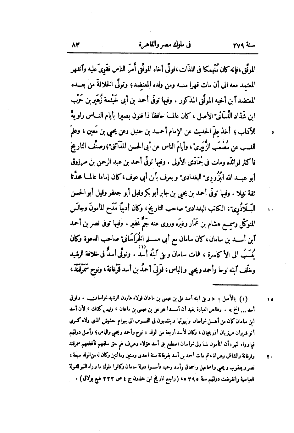 الموفّق، فإنه كان منهمكا في اللذّات، فولّى أخاه الموفّق أمر الناس فقوى عليه وانقهر المعتمد معه الى أن مات قهرا منه ومن ولده المعتضد؛ وتولّى الخلافة من بعده المعتضد ابن أخيه الموفّق المذكور. وفيها توفّى أحمد بن أبى خيثمة زهير بن حرب ابن شدّاد النّسائىّ الأصل، كان عالما حافظا ذا فنون بصيرا بأيام الناس راوية للآداب؛ أخذ علم الحديث عن الإمام أحمد بن حنبل وعن يحيى بن معين، وعلم النسب عن مصعب الزّبيرىّ، وأيام الناس عن أبى الحسن المدائنىّ؛ وصنّف التاريخ فأكثر فوائده ومات في جمادى الأولى. وفيها توفّى أحمد بن عبد الرّحمن بن مرزوق أبو عبد الله البزورىّ البغدادىّ ويعرف بابن أبى عوف، كان إماما عالما محدّثا ثقة نبيلا. وفيها توفّى أحمد بن يحيى بن جابر أبو بكر وقيل أبو جعفر وقيل أبو الحسن البلاذرىّ، الكاتب البغدادىّ صاحب التاريخ، وكان أديبا مدح المأمون وجالس المتوكّل وسمع هشام بن عمّار وغيره وروى عنه جمّ غفير. وفيها توفى نصر بن أحمد ابن أسد بن سامان، كان سامان مع أبى مسلم الخراسانىّ صاحب الدعوة وكان ينسب الى الأكاسرة، فمات سامان وبقى ابنه أسد «1» . وتوفّى أسد في خلافة الرشيد وخلّف ابنه نوحا وأحمد ويحيى وإلياس، فولى أحمد بن أسد فرغانة، ونوح سمرقند،