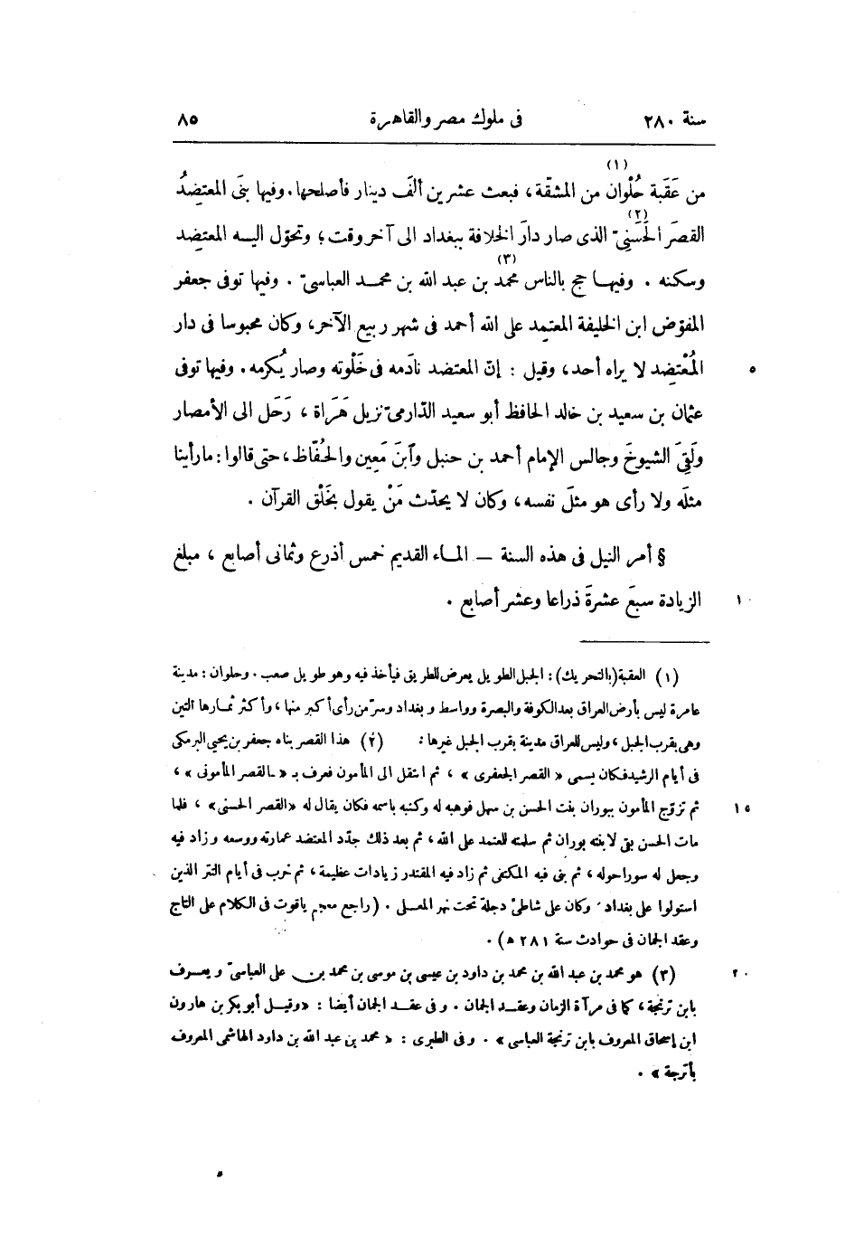 من عقبة حلوان «1» من المشقّة، فبعث عشرين ألف دينار فأصلحها. وفيها بنى المعتضد القصر الحسنىّ «2» الذي صار دار الخلافة ببغداد الى آخر وقت؛ وتحوّل إليه المعتضد وسكنه. وفيها حج بالناس محمد «3» بن عبد الله بن محمد العباسىّ. وفيها توفى جعفر المفوّض ابن الخليفة المعتمد على الله أحمد في شهر ربيع الآخر، وكان محبوسا في دار المعتضد لا يراه أحد، وقيل: إنّ المعتضد نادمه في خلوته وصار يكرمه. وفيها توفى عثمان بن سعيد بن خالد الحافظ أبو سعيد الدّارمىّ نزيل هراة، رحل الى الأمصار ولقى الشيوخ وجالس الإمام أحمد بن حنبل وابن معين والحفّاظ، حتى قالوا: ما رأينا مثله ولا رأى هو مثل نفسه، وكان لا يحدّث من يقول بخلق القرآن.