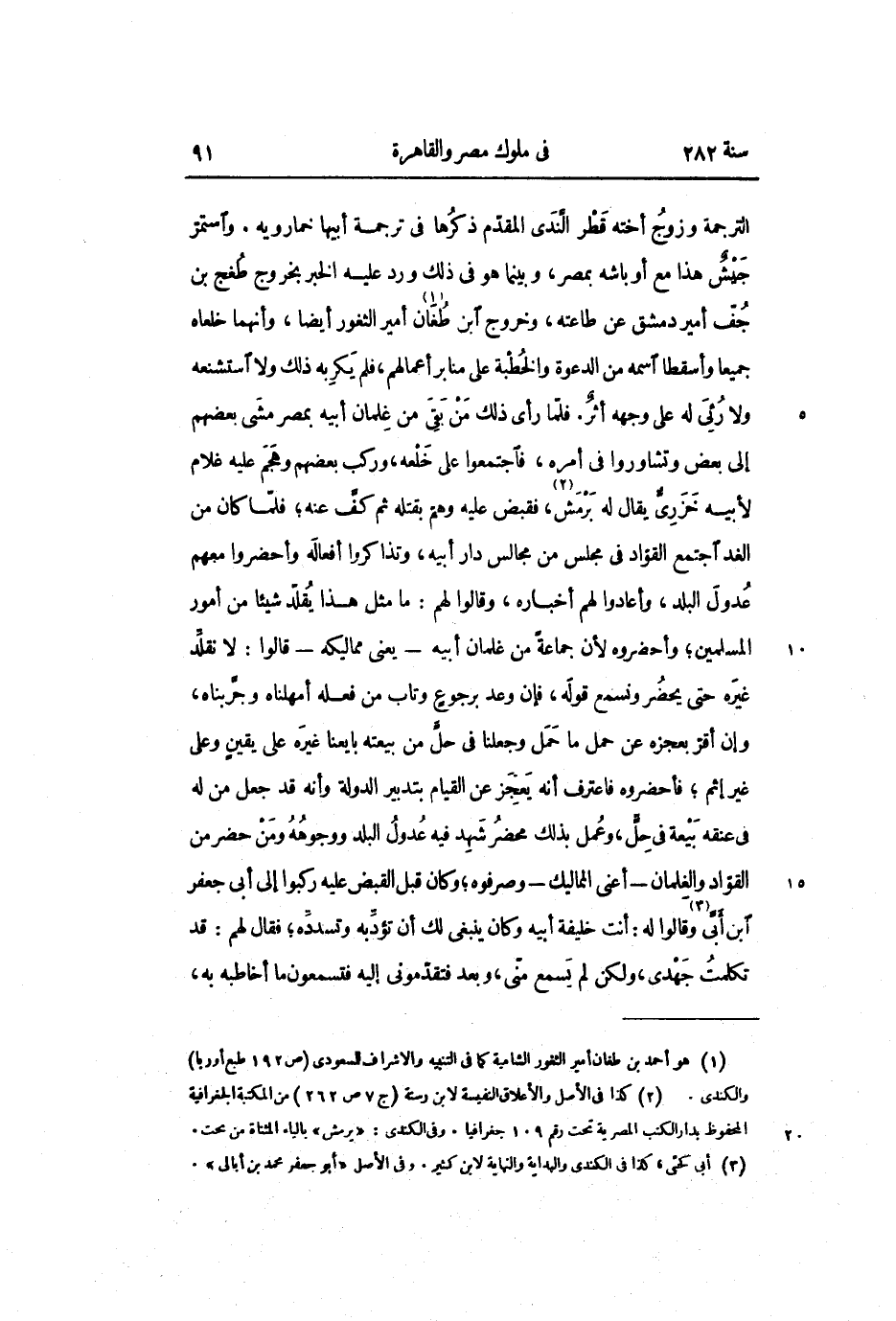 الترجمة وزوج أخته قطر النّدى المقدّم ذكرها في ترجمة أبيها خمارويه. واستمرّ جيش هذا مع أوباشه بمصر، وبينما هو في ذلك ورد عليه الخبر بخروج طغج بن جفّ أمير دمشق عن طاعته، وخروج ابن طغان «1» أمير الثغور أيضا، وأنهما خلعاه جميعا وأسقطا اسمه من الدعوة والخطبة على منابر أعمالهم، فلم يكر به ذلك ولا استشنعه ولا رئى له على وجهه أثر. فلمّا رأى ذلك من بقى من غلمان أبيه بمصر مشى بعضهم إلى بعض وتشاوروا في أمره، فاجتمعوا على خلعه، وركب بعضهم وهجم عليه غلام لأبيه خزرىّ يقال له برمش «2» ، فقبض عليه وهمّ بقتله ثم كفّ عنه؛ فلمّا كان من الغد اجتمع القوّاد في مجلس من مجالس دار أبيه، وتذاكروا أفعاله وأحضروا معهم عدول البلد، وأعادوا لهم أخباره، وقالوا لهم: ما مثل هذا يقلّد شيئا من أمور المسلمين؛ وأحضروه لأن جماعة من غلمان أبيه- يعنى مماليكه- قالوا: لا نقلّد غيره حتى يحضر ونسمع قوله، فإن وعد برجوع وتاب من فعله أمهلناه وجرّبناه، وإن أقرّ بعجزه عن حمل ما حمل وجعلنا في حلّ من بيعته بايعنا غيره على يقين وعلى غير إثم؛ فأحضروه فاعترف أنه يعجز عن القيام بتدبير الدولة وأنه قد جعل من له فى عنقه بيعة في حلّ، وعمل بذلك محضر شهد فيه عدول البلد ووجوهه ومن حضر من القوّاد والغلمان- أعنى المماليك- وصرفوه؛ وكان قبل القبض عليه ركبوا إلى أبى جعفر ابن أبىّ «3» وقالوا له: أنت خليفة أبيه وكان ينبغى لك أن تؤدّبه وتسددّه؛ فقال لهم: قد تكلمت جهدى، ولكن لم يسمع منّى، وبعد فتقدّمونى إليه فتسمعون ما أخاطبه به،