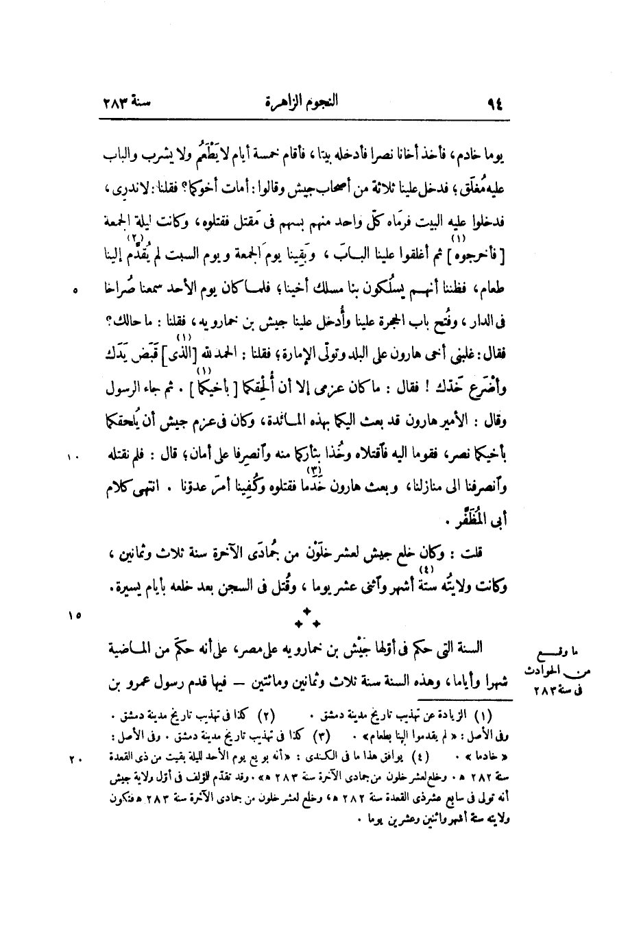 السنة التى حكم في أوّلها جيش بن خمارويه على مصر، على أنه حكم من الماضية شهرا وأياما، وهذه السنة سنة ثلاث وثمانين ومائتين- فيها قدم رسول عمرو بن