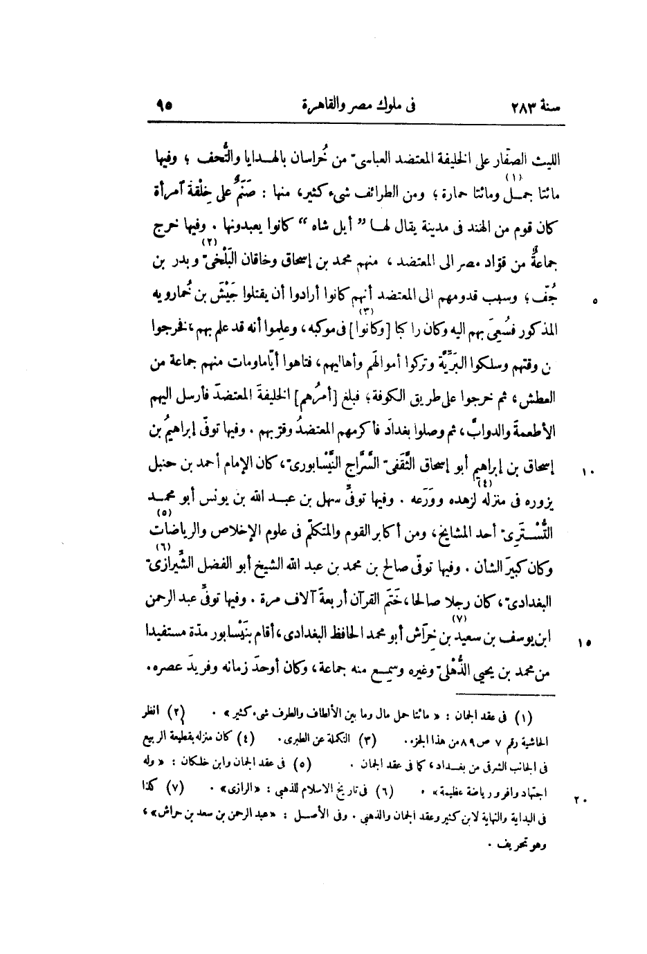 الليث الصفّار على الخليفة المعتضد العباسىّ من خراسان بالهدايا والتّحف؛ وفيها مائتا جمل «1» ومائتا حمارة؛ ومن الطرائف شىء كثير، منها: صنم على خلقة امرأة كان قوم من الهند في مدينة يقال لها" أيل شاه" كانوا يعبدونها. وفيها خرج جماعة من قوّاد مصر الى المعتضد، منهم محمد بن إسحاق وخاقان البلخىّ «2» وبدر بن جفّ؛ وسبب قدومهم الى المعتضد أنهم كانوا أرادوا أن يقتلوا جيش بن خمارويه المذكور فسعى بهم إليه وكان راكبا [وكانوا «3» ] فى موكبه، وعلموا أنه قد علم بهم، فخرجوا من وقتهم وسلكوا البرّيّة وتركوا أموالهم وأهاليهم، فتاهوا أيّاما ومات منهم جماعة من العطش، ثم خرجوا على طريق الكوفة؛ فبلغ [أمرهم] الخليفة المعتضد فأرسل اليهم الأطعمة والدوابّ، ثم وصلوا بغداد فأكرمهم المعتضد وقرّبهم. وفيها توفّى إبراهيم بن إسحاق بن إبراهيم أبو إسحاق الثّقفىّ السّرّاج النيسابورىّ، كان الإمام أحمد بن حنبل يزوره في منزله «4» لزهده وورعه. وفيها توفّى سهل بن عبد الله بن يونس أبو محمد التّسترىّ أحد المشايخ، ومن أكابر القوم والمتكلّم في علوم الإخلاص والرياضات «5» وكان كبير الشأن. وفيها توفّى صالح بن محمد بن عبد الله الشيخ أبو الفضل الشّيرازىّ «6» البغدادىّ، كان رجلا صالحا، ختم القرآن أربعة آلاف مرة. وفيها توفّى عبد الرّحمن ابن يوسف بن سعيد «7» بن خراش أبو محمد الحافظ البغدادى، أقام بنيسابور مدّة مستفيدا من محمد بن يحيى الذّهلىّ وغيره وسمع منه جماعة، وكان أوحد زمانه وفريد عصره.