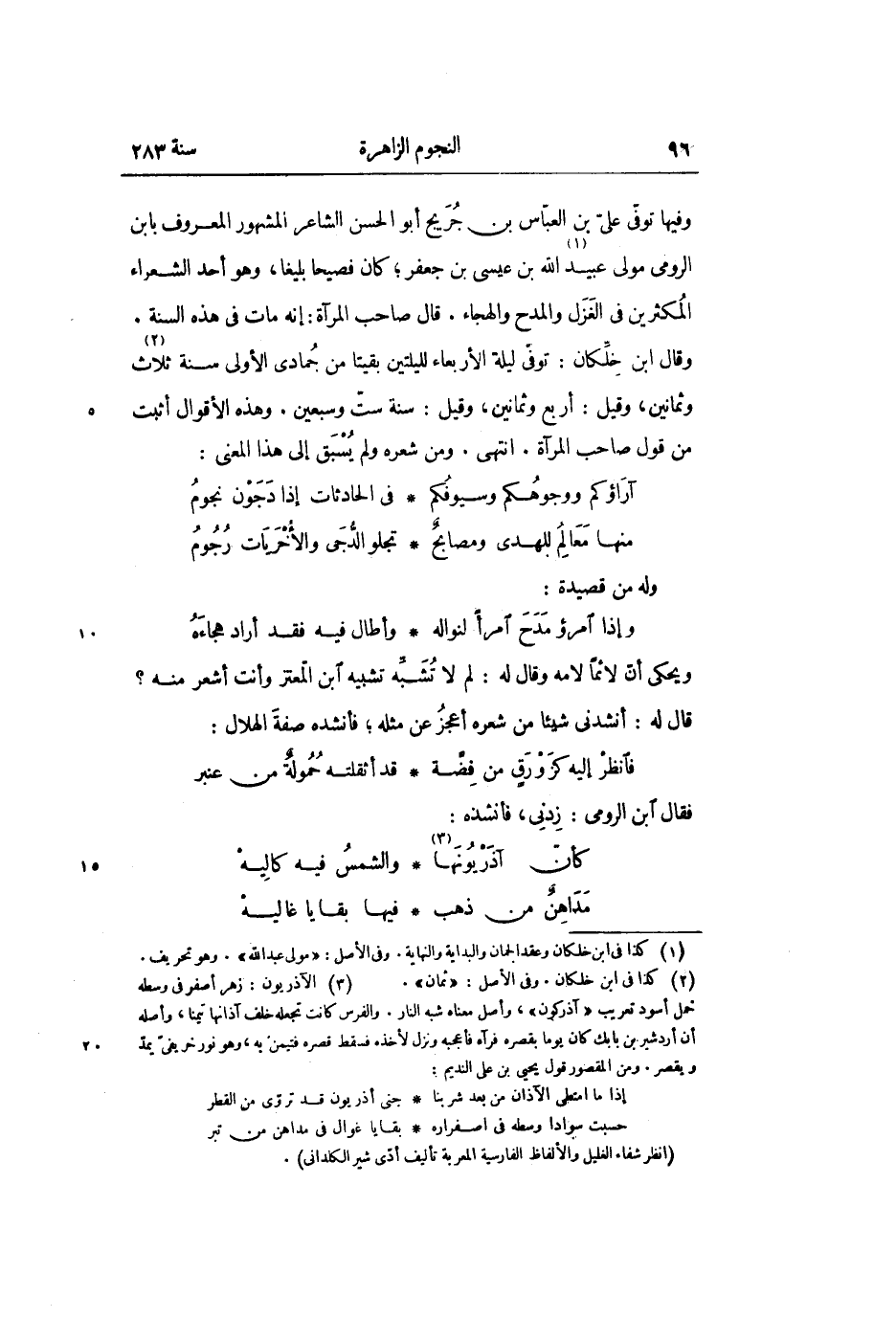 وفيها توفّى علىّ بن العبّاس بن جريح أبو الحسن الشاعر المشهور المعروف بابن الرومى مولى عبيد الله «1» بن عيسى بن جعفر؛ كان فصيحا بليغا، وهو أحد الشعراء المكثرين في الغزل والمدح والهجاء. قال صاحب المرآة: إنه مات في هذه السنة.