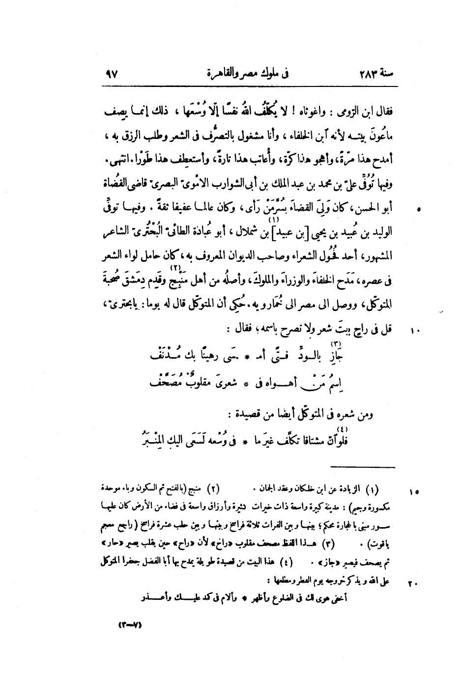 وفيها توفّى علىّ بن محمد بن عبد الملك بن أبى الشوارب الأموىّ البصرىّ قاضى القضاة أبو الحسن، كان ولى القضاء بسرّمن رأى، وكان عالما عفيفا ثقة. وفيها توفّى الوليد بن عبيد بن يحيى [بن عبيد «1» ] بن شملال، أبو عبادة الطائىّ البحترىّ الشاعر المشهور، أحد فحول الشعراء وصاحب الديوان المعروف به، كان حامل لواء الشعر فى عصره، مدح الخلفاء والوزراء والملوك، وأصله من أهل منبج «2» وقدم دمشق صحبة المتوكّل، ووصل الى مصر الى خمارويه. حكى أن المتوكّل قال له يوما: يا بحترىّ، قل في راح بيت شعر ولا تصرح باسمه؛ فقال: