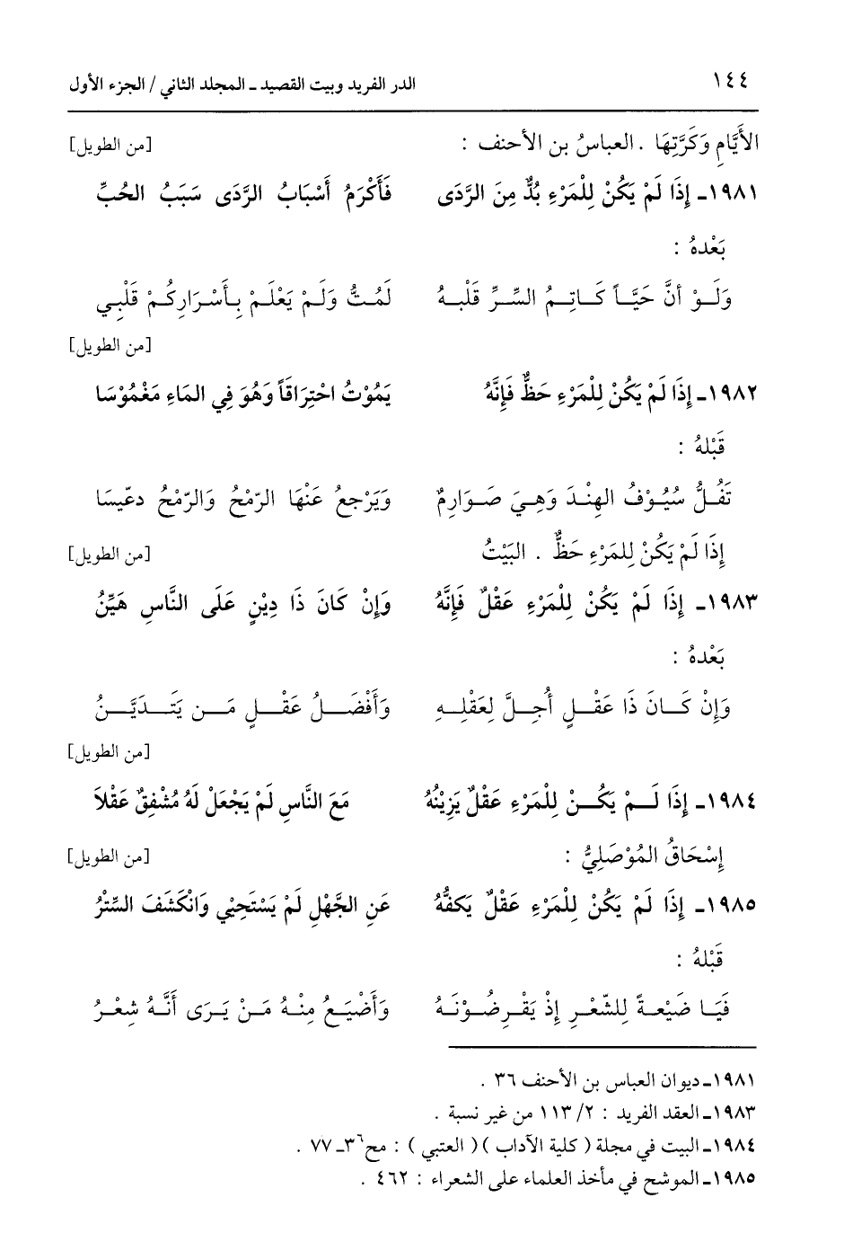 1984 - إِذَا لَمْ يَكُنْ لِلْمَرْءِ عَقْلٌ يَزِيْنُهُ ... مَعَ النَّاسِ لَمْ يَجْعَلْ لَهُ مُشْفِقٌ عَقْلَا