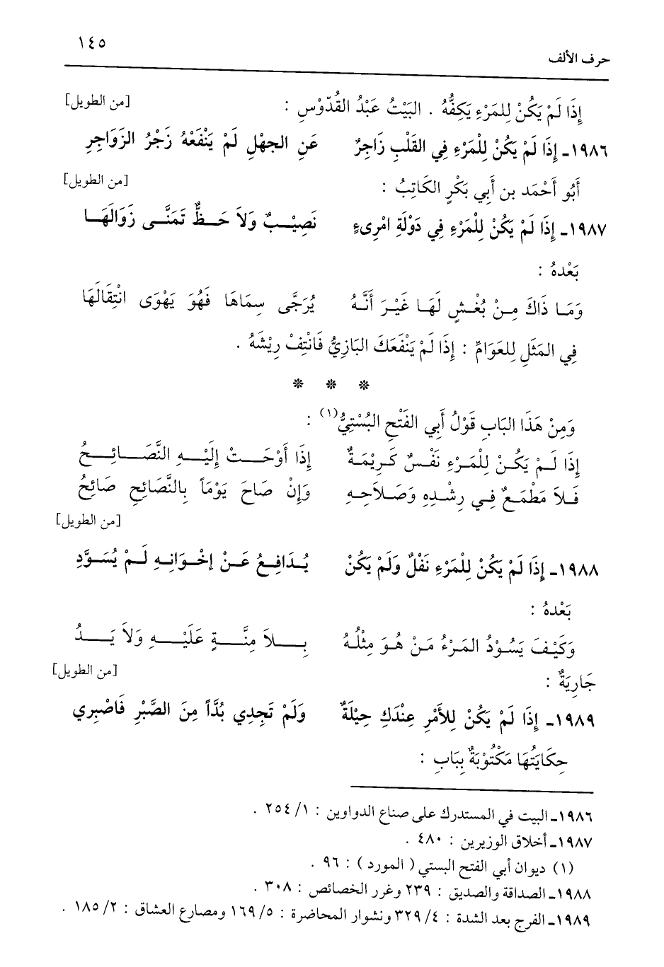 1988 - إِذَا لَمْ يكُنْ لِلْمَرْءِ نَفْلٌ وَلَمْ يَكُنْ ... يُدَافِعُ عَنْ إخْوَانِهِ لَمْ يُسَوَّدِ
