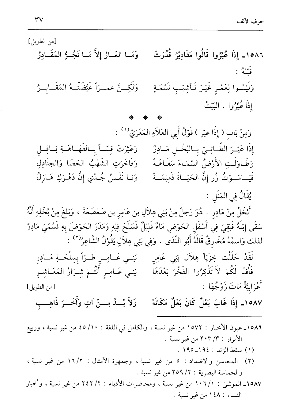 1586 - عيون الأخبار: 1572 من غير نسبة، والكامل في اللغة: 10/ 45 من غير نسبة، وربيع الأبرار: 3/ 203 من غير نسبة.
