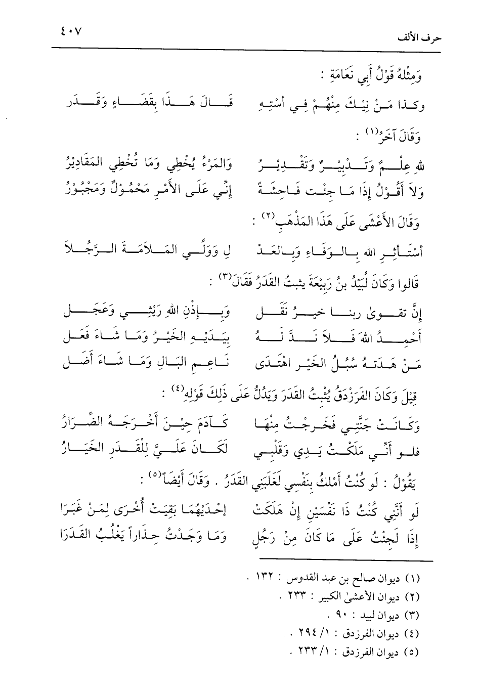 قِيْلَ وَكَانَ الفَرَزْدَقُ يُثْبِتُ القَدَرَ وَيَدُلُّ عَلَى ذَلِكَ قَوْلِهِ (¬4):