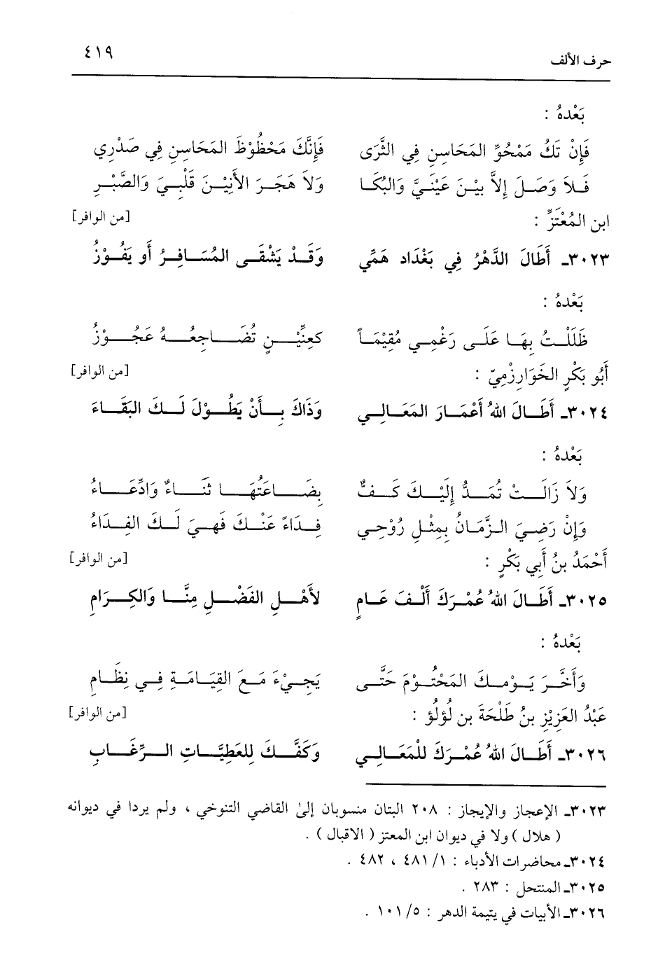 3023 - الإعجاز والإيجاز: 208 البيتان منسوبان إلى القاضي التنوخي، ولم يردا في ديوانه (هلال) ولا في ديوان ابن المعتز (الاقبال).