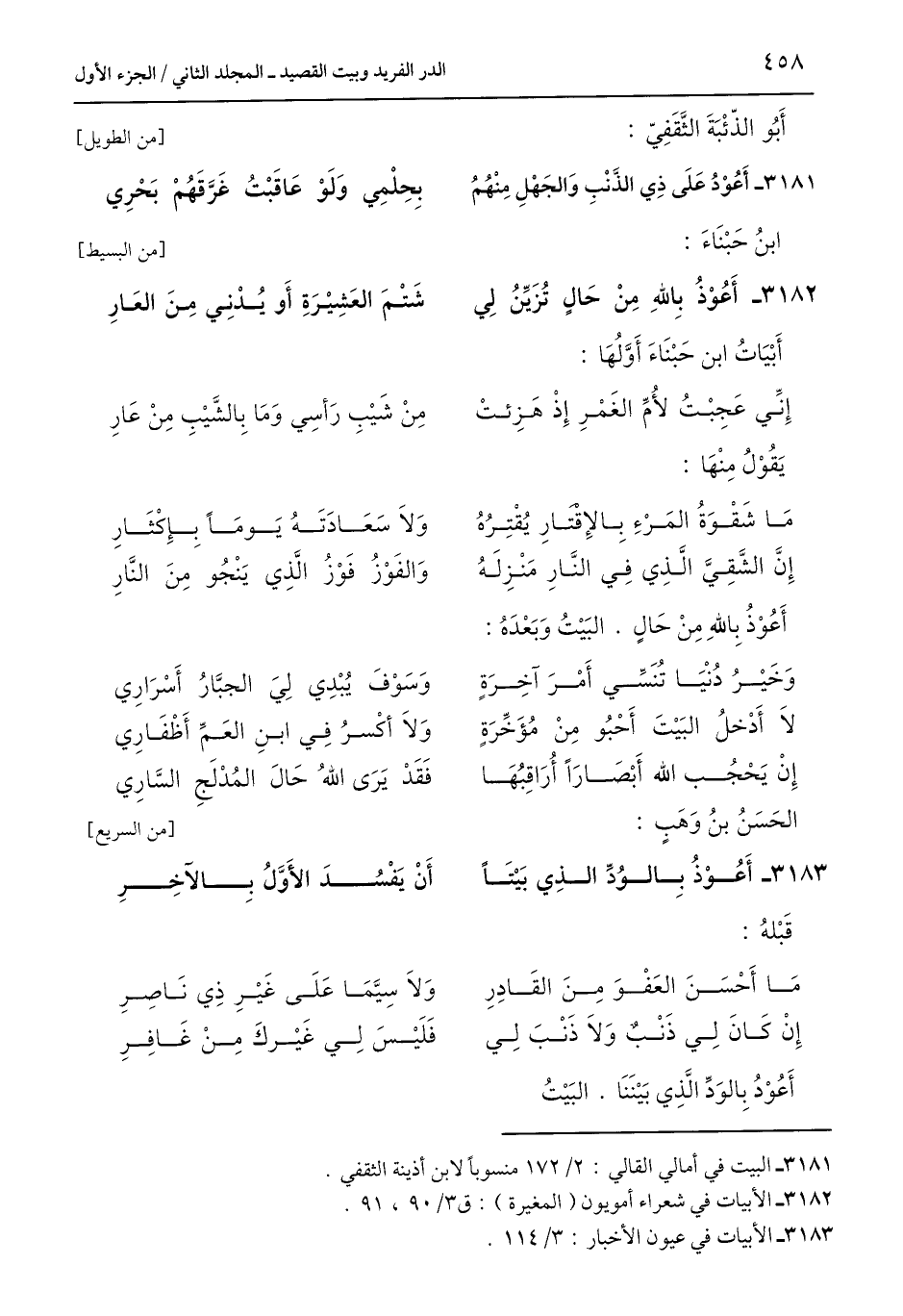 3182 - أَعُوْذُ بِاللَّهِ مِنْ حَالٍ تُزَيِّنُ لِي ... شَتْمَ العَشِيْرَةِ أَو يُدْنِي مِنَ العَارِ