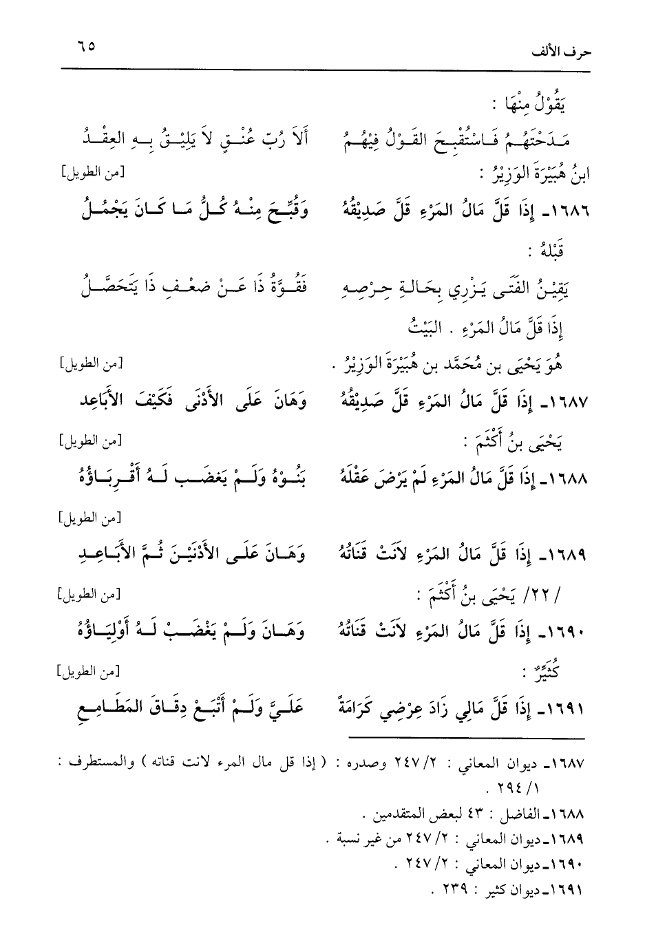 1689 - إِذَا قَلَّ مَالُ المَرْءِ لَانَتْ قَنَاتُهُ ... وَهَانَ عَلَى الأَدْنَيْنَ ثُمَّ الأَبَاعِدِ