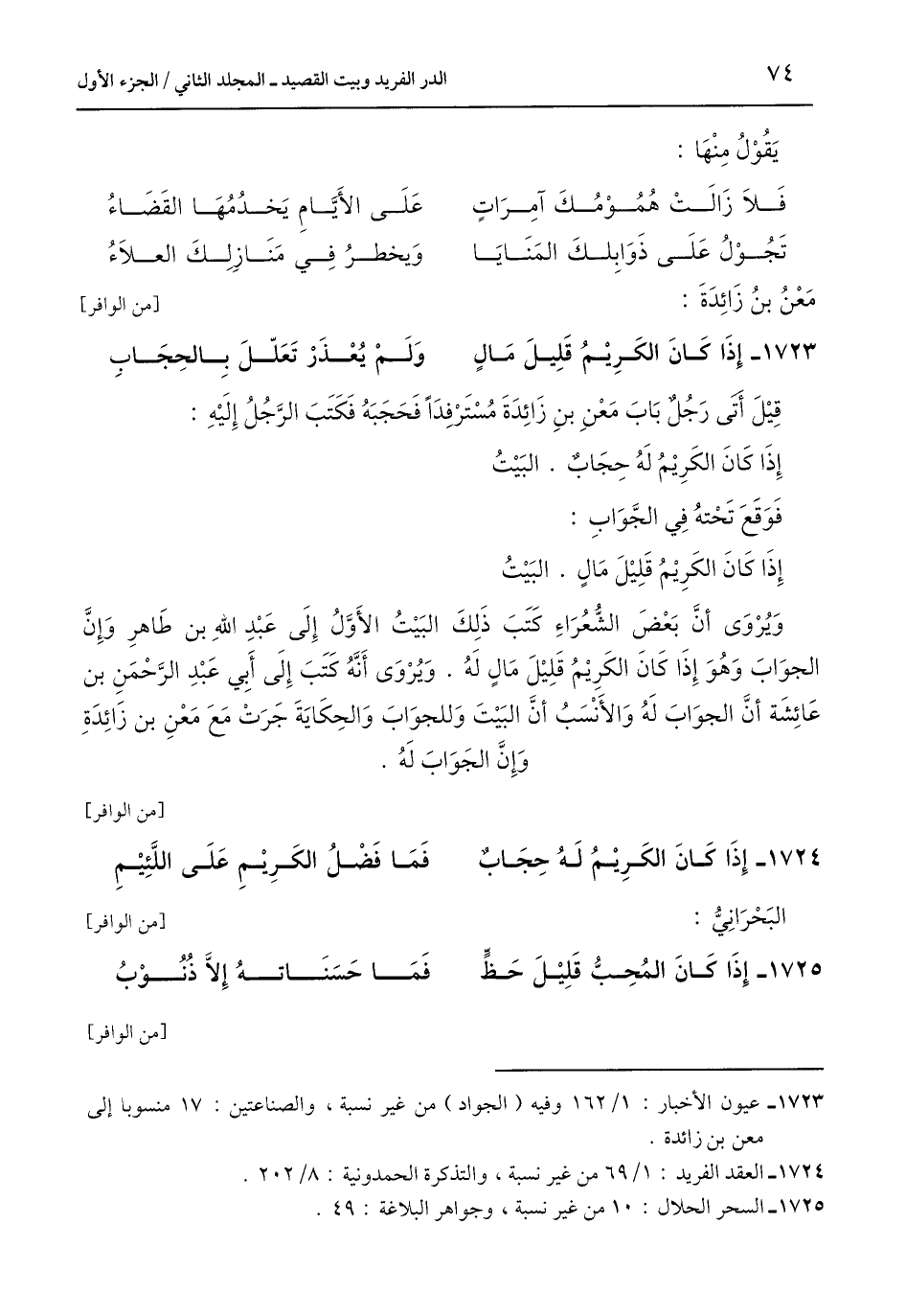 وَيُرْوَى أَنَّ بَعْضَ الشُّعُرَاءِ كَتَبَ ذَلِكَ البَيْتُ الأَوَّلُ إِلَى عَبْدِ اللَّهِ بن طَاهرِ وَإِنَّ الجوَابَ وَهُوَ إِذَا كَانَ الكَرِيْمُ قَلِيْلَ مَالٍ لَهُ. وَيُرْوَى أَنَّهُ كَتَبَ إِلَى أَبِي عَبْدِ الرَّحْمَنِ بن عَائِشَة أَنَّ الجوَابَ لَهُ وَالأَنْسَبُ أَنَّ البَيْتَ وَللجوَابَ وَالحِكَايَةَ جَرَتْ مَعَ مَعْنِ بن زَائِدَةِ وَإِنَّ الجَوَابَ لَهُ.
