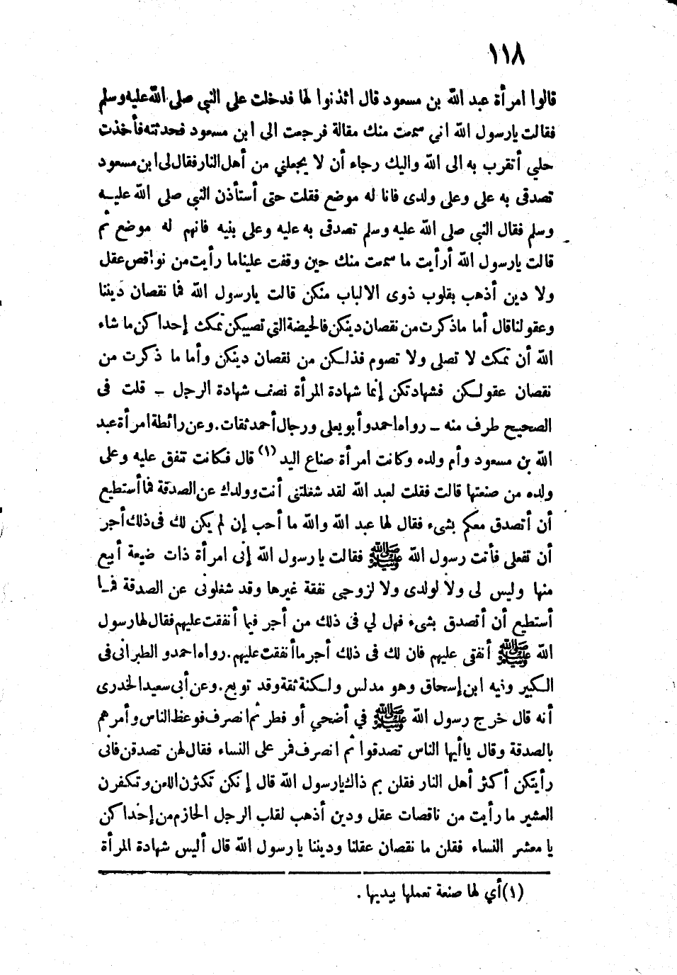 قَالُوا: امْرَأَةُ عَبْدِ اللَّهِ بْنِ مَسْعُودٍ، قَالَ: " ائْذَنُوا لَهَا ". فَدَخَلَتْ عَلَى النَّبِيِّ - صَلَّى اللَّهُ عَلَيْهِ وَسَلَّمَ - فَقَالَتْ: يَا رَسُولَ اللَّهِ، إِنِّي سَمِعْتُ مِنْكَ مَقَالَةً فَرَجَعْتُ إِلَى ابْنِ مَسْعُودٍ، فَحَدَّثْتُهُ، فَأَخَذْتُ حُلِيِّي أَتَقَرَّبُ بِهِ إِلَى اللَّهِ وَإِلَيْكَ رَجَاءَ أَنْ لَا يَجْعَلَنِي اللَّهُ مِنْ أَهْلِ النَّارِ. فَقَالَ لِي ابْنُ مَسْعُودٍ: تَصَدَّقِي بِهِ عَلَيَّ، وَعَلَى وَلَدِي، فَإِنَّا لَهُ مَوْضِعٌ، فَقُلْتُ: حَتَّى أَسْتَأْذِنَ النَّبِيَّ - صَلَّى اللَّهُ عَلَيْهِ وَسَلَّمَ -. فَقَالَ النَّبِيُّ - صَلَّى اللَّهُ عَلَيْهِ وَسَلَّمَ -: " تَصَدَّقِي بِهِ عَلَيْهِ، وَعَلَى بَنِيهِ، فَإِنَّهُمْ لَهُ مَوْضِعٌ ". ثُمَّ قَالَتْ: يَا رَسُولَ اللَّهِ، أَرَأَيْتَ مَا سَمِعْتُ مِنْكَ حِينَ وَقَفْتَ عَلَيْنَا " مَا رَأَيْتُ مِنْ نَوَاقِصِ عَقْلٍ [قَطْ] وَلَا دِينٍ أَذْهَبَ بِقُلُوبِ ذَوِي الْأَلْبَابِ مِنْكُنَّ؟ " قَالَتْ: يَا رَسُولَ اللَّهِ، فَمَا نُقْصَانُ دِينِنَا وَعُقُولِنَا؟ قَالَ: " أَمَّا مَا ذَكَرْتُ مِنْ نُقْصَانِ دِينِكُنَّ فَالْحَيْضَةُ الَّتِي تُصِيبُكُنَّ تَمْكُثُ إِحْدَاكُنَّ مَا شَاءَ اللَّهُ أَنْ تَمْكُثَ لَا تُصَلِّي وَلَا تَصُومُ، فَذَلِكُنَّ مِنْ نُقْصَانِ دِينِكُنَّ، وَأَمَّا مَا ذَكَرْتُ مِنْ نُقْصَانِ عُقُولِكُنَّ فَشَهَادَتُكُنَّ إِنَّمَا شَهَادَةُ الْمَرْأَةِ نِصْفُ شَهَادَةِ الرَّجُلِ».