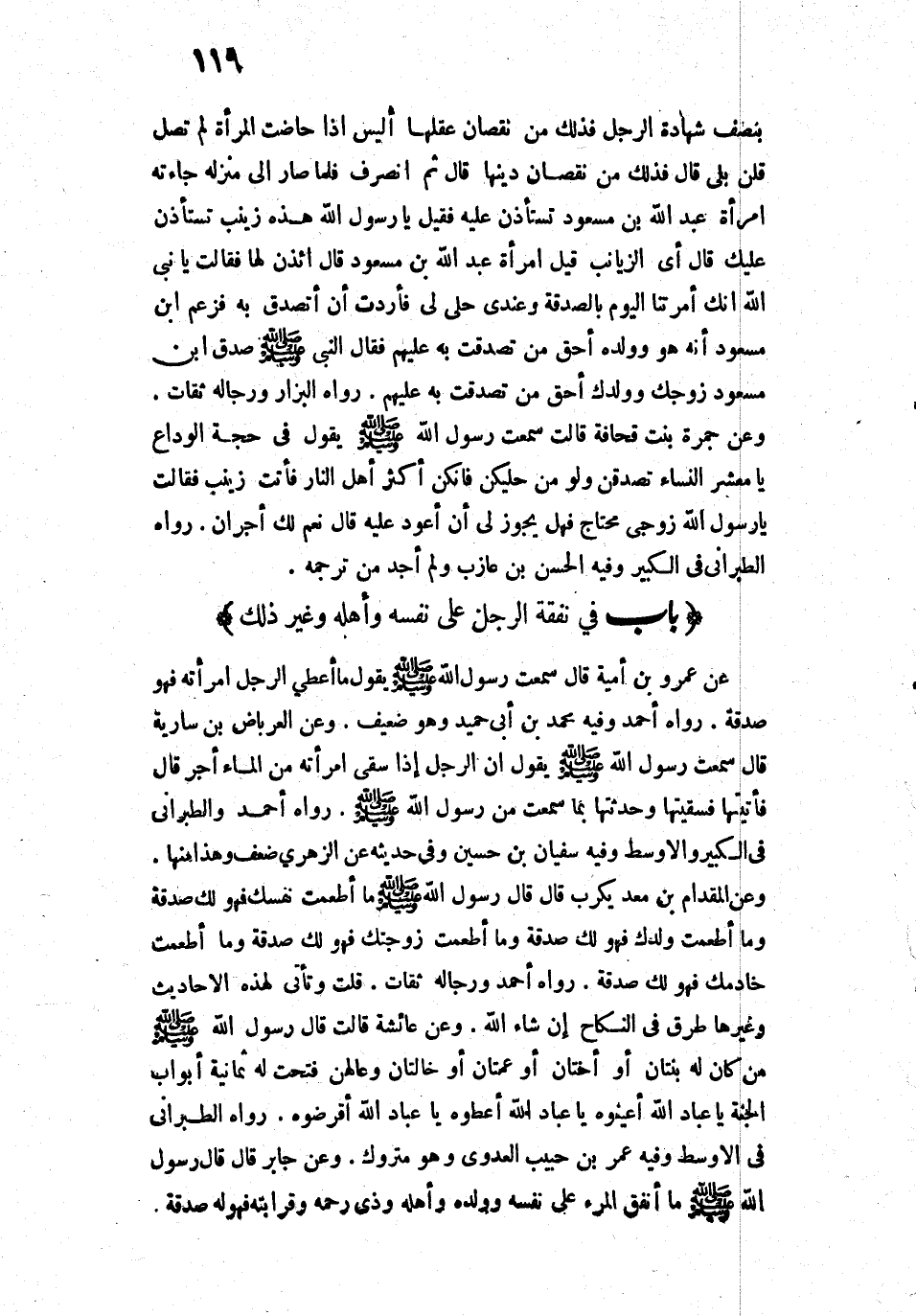 بِنِصْفِ شَهَادَةِ الرَّجُلِ؟ فَذَلِكَ مِنْ نُقْصَانِ عَقْلِهَا. أَلَيْسَ إِذَا حَاضَتِ الْمَرْأَةُ لَمْ تُصَلِّ؟ ". قُلْنَ: بَلَى. قَالَ: " فَذَلِكَ مِنْ نُقْصَانِ دِينِهَا ". قَالَ: ثُمَّ انْصَرَفَ فَلَمَّا صَارَ إِلَى مَنْزِلِهِ جَاءَتْهُ امْرَأَةُ عَبْدِ اللَّهِ بْنِ مَسْعُودٍ تَسْتَأْذِنُ عَلَيْهِ، فَقِيلَ: يَا رَسُولَ اللَّهِ، هَذِهِ زَيْنَبُ تَسْتَأْذِنُ عَلَيْكَ. قَالَ: " أَيُّ الزَّيَانِبُ؟ ". قِيلَ: امْرَأَةُ عَبْدِ اللَّهِ بْنِ مَسْعُودٍ. قَالَ: " ائْذَنْ لَهَا ". فَأَذِنَ لَهَا فَقَالَتْ: يَا نَبِيَّ اللَّهِ، إِنَّكَ أَمَرْتَنَا الْيَوْمَ بِالصَّدَقَةِ، وَعِنْدِي حُلِيٌّ لِي، فَأَرَدْتُ أَنْ أَتَصَدَّقَ بِهِ فَزَعْمَ ابْنُ مَسْعُودٍ أَنَّهُ هُوَ وَوَلَدُهُ أَحَقُّ مَنْ تَصَدَّقْتُ بِهِ عَلَيْهِمْ، فَقَالَ النَّبِيُّ - صَلَّى اللَّهُ عَلَيْهِ وَسَلَّمَ -: " صَدَقَ ابْنُ مَسْعُودٍ، زَوْجُكِ وَوَلَدُكِ أَحَقُّ مَنْ تَصَدَّقْتِ بِهِ عَلَيْهِمْ».