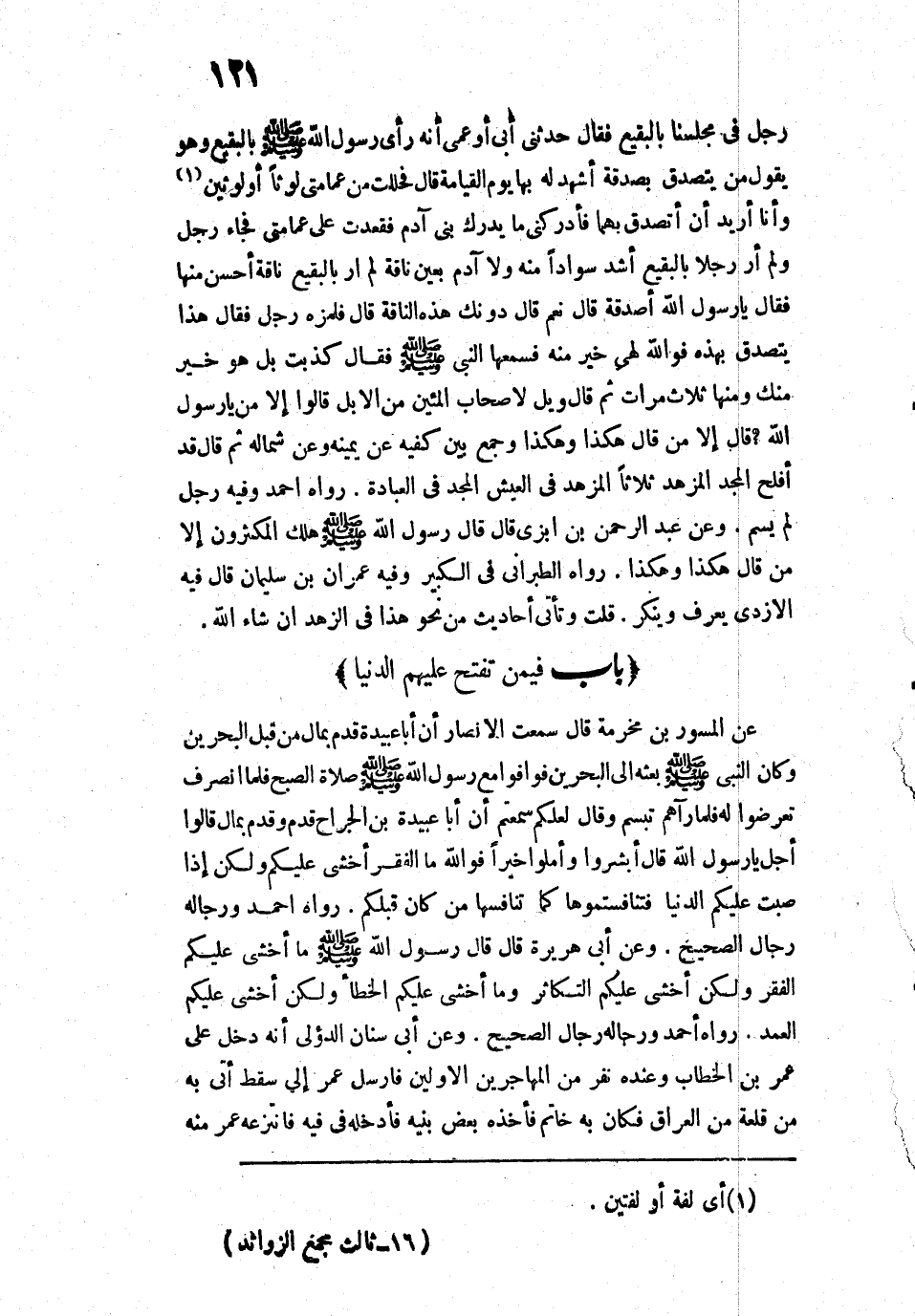 رَجُلٌ فِي مَجْلِسِنَا بِالْبَقِيعِ فَقَالَ: حَدَّثَنِي أَبِي أَوْ عَمِّي أَنَّهُ رَأَى رَسُولَ اللَّهِ - صَلَّى اللَّهُ عَلَيْهِ وَسَلَّمَ - بِالْبَقِيعِ، وَهُوَ يَقُولُ: " مَنْ يَتَصَدَّقُ بِصَدَقَةٍ أَشْهَدُ لَهُ بِهَا يَوْمَ الْقِيَامَةِ ". قَالَ: فَحَلَلْتُ مِنْ عِمَامَتِي فَجَاءَ لَوْثًا أَوْ لَوْثَيْنِ، وَأَنَا أُرِيدُ أَنْ أَتَصَدَّقَ بِهِمَا فَأَدْرَكَنِي مَا يُدْرِكُ بَنِي آدَمَ فَعَقَدْتُ عَلَيَّ عِمَامَتِي فَجَاءَ رَجُلٌ وَلَمْ أَرَ رَجُلًا بِالْبَقِيعِ أَشَدَّ سَوَادًا [أَصْفَرَ] مِنْهُ، وَلَا آدَمَ، يَعِيرُ نَاقَةٍ لَمْ أَرَ بِالْبَقِيعِ نَاقَةً أَحْسَنَ مِنْهَا، فَقَالَ: يَا رَسُولَ اللَّهِ، أَصَدَقَةٌ؟ قَالَ: " نَعَمْ ". قَالَ: دُونَكَ هَذِهِ النَّاقَةَ. قَالَ: فَلَمَزَهُ رَجُلٌ فَقَالَ: هَذَا يَتَصَدَّقُ بِهَذِهِ، فَوَاللَّهِ لَهِيَ خَيْرٌ مِنْهُ. فَسَمِعَهَا النَّبِيُّ - صَلَّى اللَّهُ عَلَيْهِ وَسَلَّمَ - فَقَالَ: " كَذَبْتَ، بَلْ هُوَ خَيْرٌ مِنْكَ وَمِنْهَا " - ثَلَاثَ مَرَّاتٍ - ثُمَّ قَالَ: " وَيْلٌ لِأَصْحَابٍ الْمِئِينِ مِنَ الْإِبِلِ " [ثَلَاثًا]. قَالُوا: إِلَّا مَنْ يَا رَسُولَ اللَّهِ؟ قَالَ: " إِلَّا مَنْ قَالَ هَكَذَا وَهَكَذَا "، وَجَمَعَ بَيْنَ كَفَّيْهِ عَنْ يَمِينِهِ، وَعَنْ شِمَالِهِ، ثُمَّ قَالَ: " قَدْ أَفْلَحَ الْمُجْهِدُ الْمُزْهِدُ " - ثَلَاثًا - " الْمُزْهِدُ فِي الْعَيْشِ الْمُجْهِدُ فِي الْعِبَادَةِ».