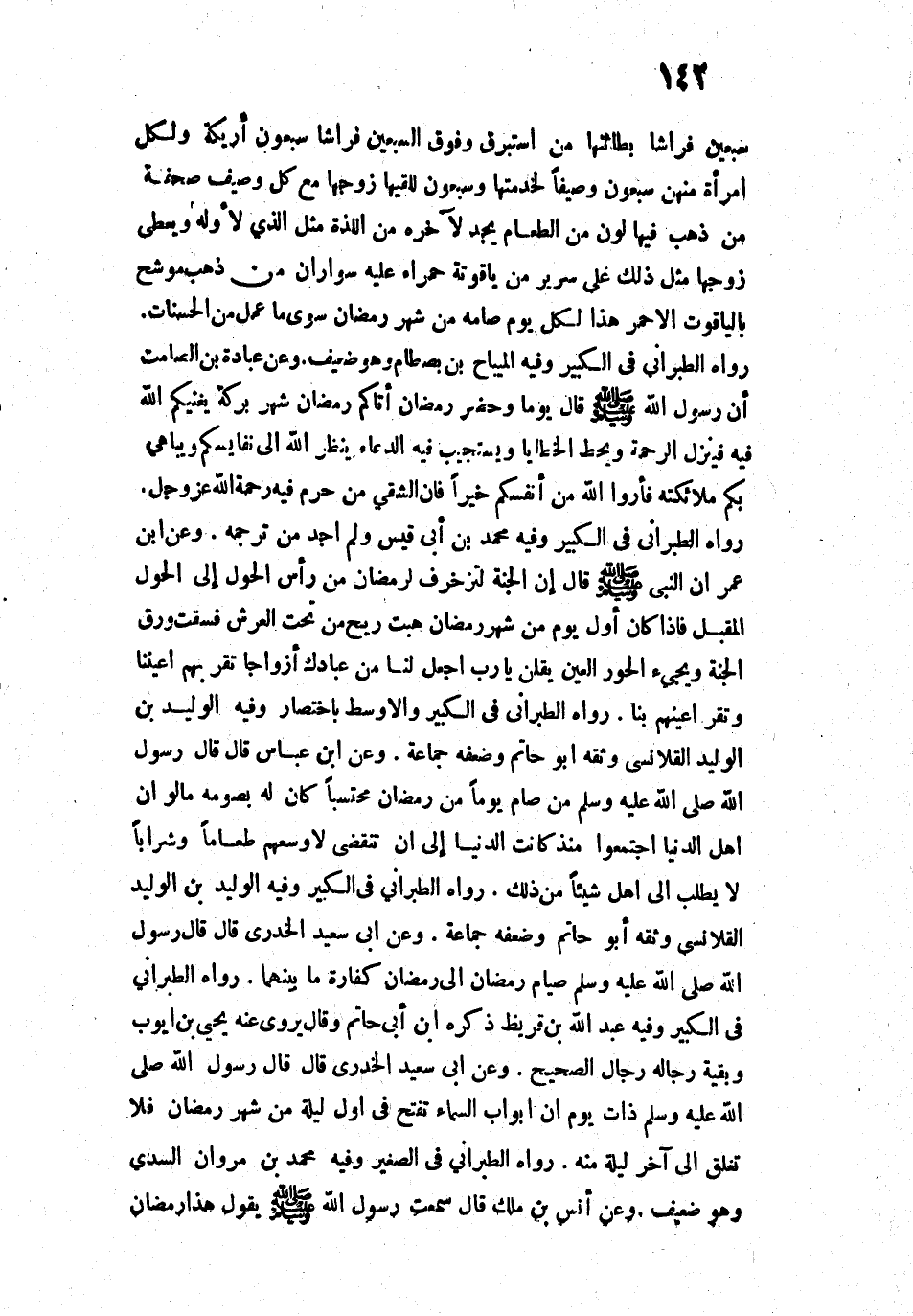 سَبْعِينَ فِرَاشًا بَطَائِنُهَا مِنْ إِسْتَبْرَقٍ، وَفَوْقَ السَّبْعِينَ فِرَاشًا سَبْعُونَ أَرِيكَةً، وَلِكُلِّ امْرَأَةٍ مِنْهُنَّ سَبْعُونَ وَصِيفًا لِخِدْمَتِهَا، وَسَبْعُونَ لِلُقْيِهَا زَوْجَهَا، مَعَ كُلِّ وَصَيْفٍ صَحْفَةٌ مِنْ ذَهَبٍ فِيهَا لَوْنٌ مِنَ الطَّعَامِ يَجِدُ لِآخِرِهِ مِنَ اللَّذَّةِ مِثْلَ الَّذِي لِأَوَّلِهِ، وَيُعْطَى زَوْجُهَا مِثْلَ ذَلِكَ عَلَى سَرِيرٍ مِنْ يَاقُوتَةٍ حَمْرَاءَ عَلَيْهِ سِوَارَانِ مِنْ ذَهَبٍ مُوَشَّحٍ بِالْيَاقُوتِ الْأَحْمَرِ، هَذَا لِكُلِّ يَوْمٍ صَامَهُ مِنْ شَهْرِ رَمَضَانَ، سِوَى مَا عَمِلَ مِنَ الْحَسَنَاتِ».