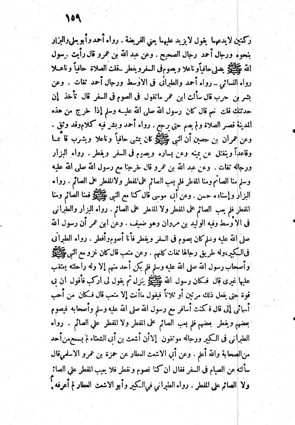 4910 - وَعَنْ بِشْرِ بْنِ حَرْبٍ قَالَ: «سَأَلْتُ ابْنَ عُمَرَ: مَا تَقُولُ فِي الصَّوْمِ فِي السَّفَرِ؟ قَالَ: تَأْخُذُ إِنْ حَدَّثْتُكَ؟ قُلْتُ: نَعَمْ. قَالَ: كَانَ رَسُولُ اللَّهِ صَلَّى اللَّهُ عَلَيْهِ وَسَلَّمَ إِذَا خَرَجَ مِنْ هَذِهِ الْمَدِينَةِ قَصَرَ الصَّلَاةَ، وَلَمْ يَصُمْ حَتَّى يَرْجِعَ».