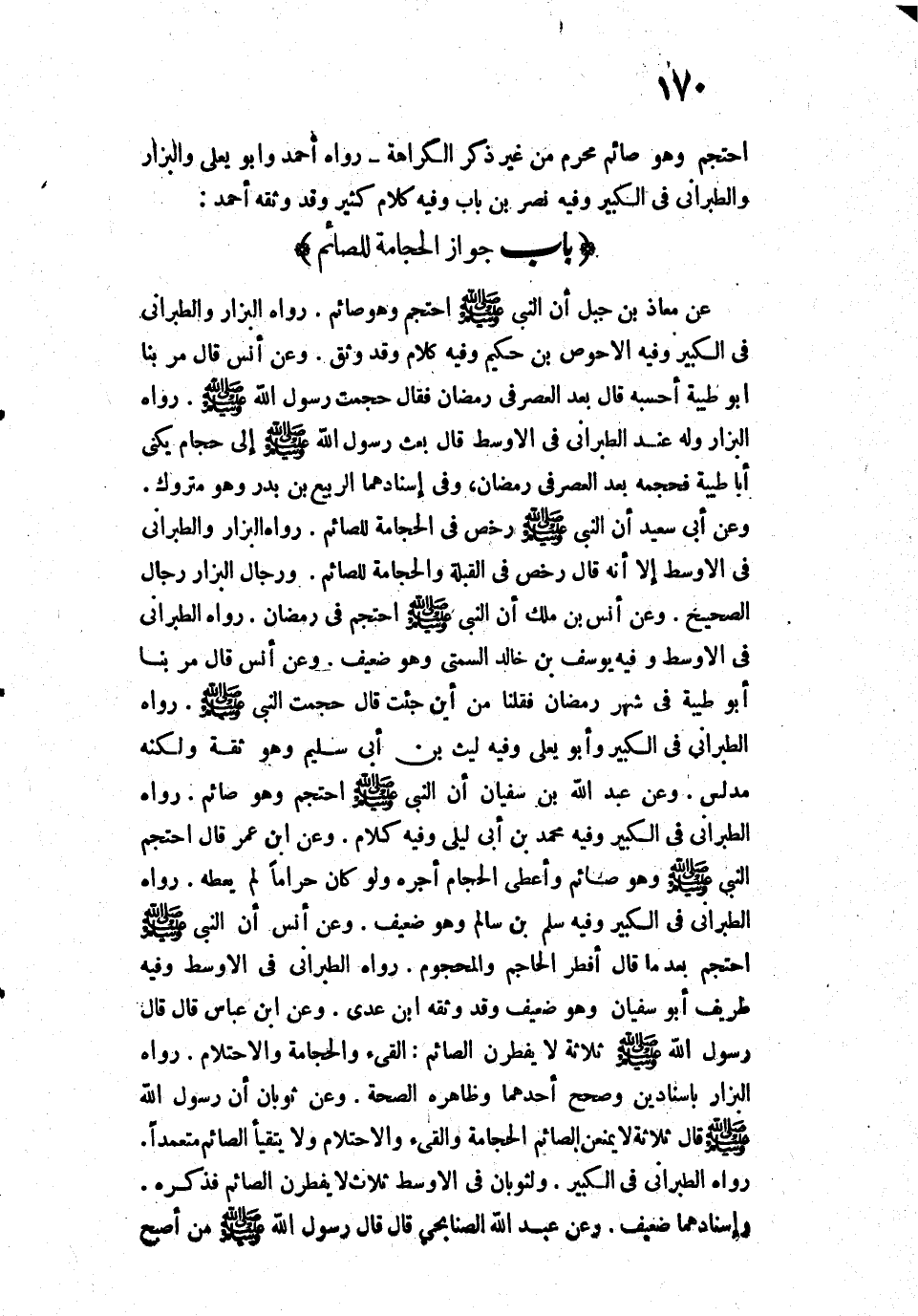 4995 - عَنْ مُعَاذِ بْنِ جَبَلٍ «أَنَّ النَّبِيَّ صَلَّى اللَّهُ عَلَيْهِ وَسَلَّمَ احْتَجَمَ وَهُوَ صَائِمٌ».