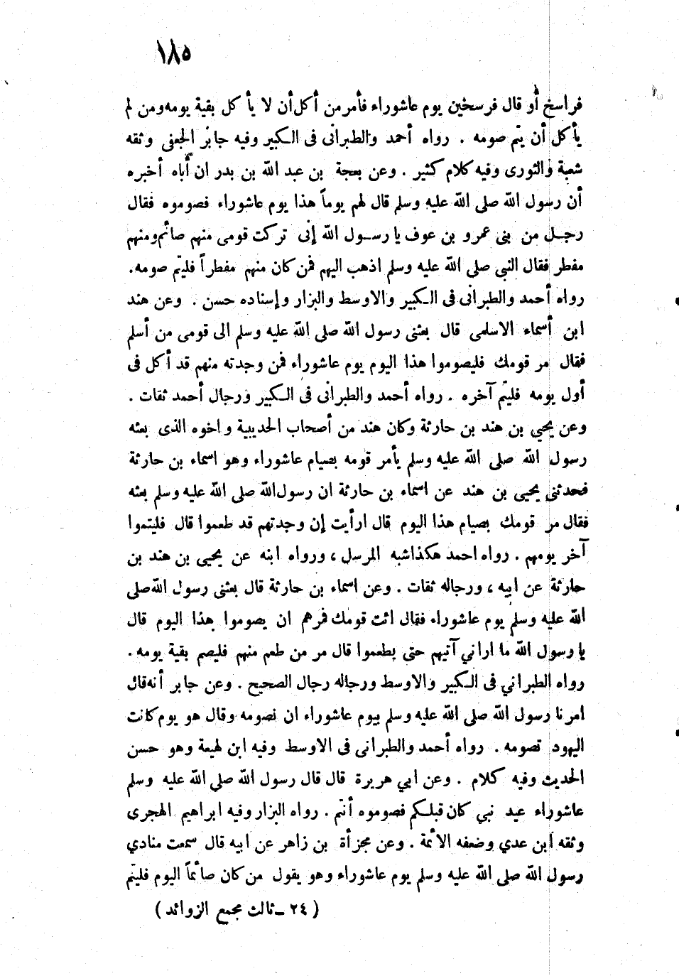 فَرَاسِخَ - أَوْ قَالَ: فَرْسَخَيْنِ - يَوْمَ عَاشُورَاءَ، فَأَمَرَ مَنْ أَكَلَ أَنْ لَا يَأْكُلَ بَقِيَّةَ يَوْمِهِ، وَمَنْ لَمْ يَأْكُلْ أَنْ يُتِمَّ صَوْمَهُ».